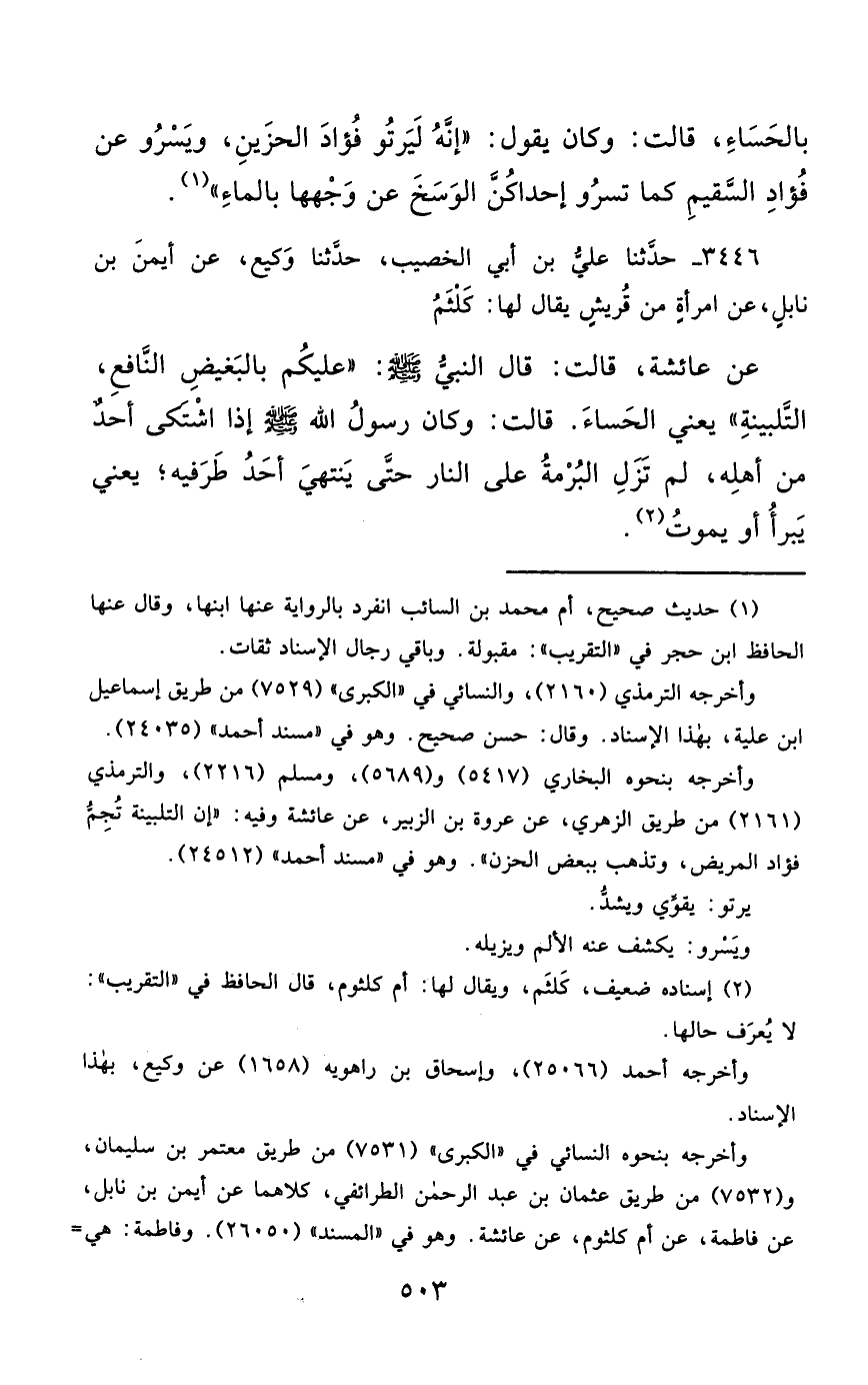 3446- حَدَّثَنَا عَلِيُّ بْنُ أَبِي الْخَصِيبِ ، حَدَّثَنَا وَكِيعٌ ، عَنْ أَيْمَنَ بْنِ نَابِلٍ ، عَنِ امْرَأَةٍ ، مِنْ قُرَيْشٍ يُقَالَ لَهَا كَلْثُمٌ ، عَنْ عَائِشَةَ ، قَالَتْ : قَالَ النَّبِيُّ صَلَّى الله عَليْهِ وسَلَّمَ : عَلَيْكُمْ بِالْبَغِيضِ النَّافِعِ التَّلْبِينَةِ يَعْنِي الْحَسَاءَ , وَكَانَ رَسُولُ اللهِ صَلَّى الله عَليْهِ وسَلَّمَ إِذَا اشْتَكَى أَحَدٌ مِنْ أَهْلِهِ ، لَمْ تَزَلِ الْبُرْمَةُ عَلَى النَّارِ ، حَتَّى يَنْتَهِيَ أَحَدُ طَرَفَيْهِ ، يَعْنِي يَبْرَأُ أَوْ يَمُوتُ.
