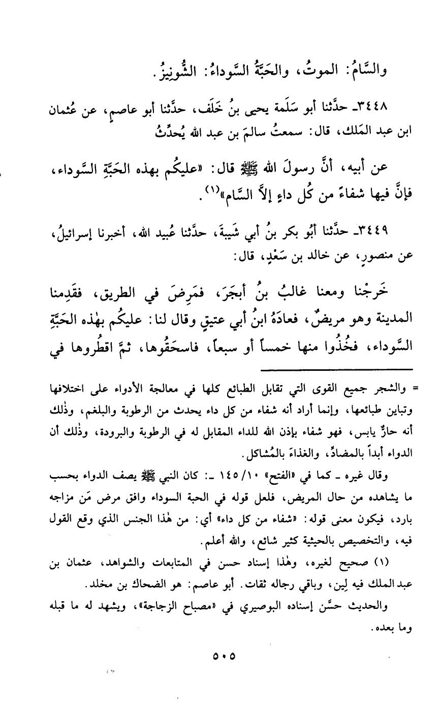 3448- حَدَّثَنَا أَبُو سَلَمَةَ يَحْيَى بْنُ خَلَفٍ ، حَدَّثَنَا أَبُو عَاصِمٍ ، عَنْ عُثْمَانَ بْنِ عَبْدِ الْمَلِكِ ، قَالَ : سَمِعْتُ سَالِمَ بْنَ عَبْدِ اللهِ ، يُحَدِّثُ عَنْ أَبِيهِ ؛ أَنَّ رَسُولَ اللهِ صَلَّى الله عَليْهِ وسَلَّمَ قَالَ : عَلَيْكُمْ بِهَذِهِ الْحَبَّةِ السَّوْدَاءِ ، فَإِنَّ فِيهَا شِفَاءً مِنْ كُلِّ دَاءٍ ، إِلاَّ السَّامَ.