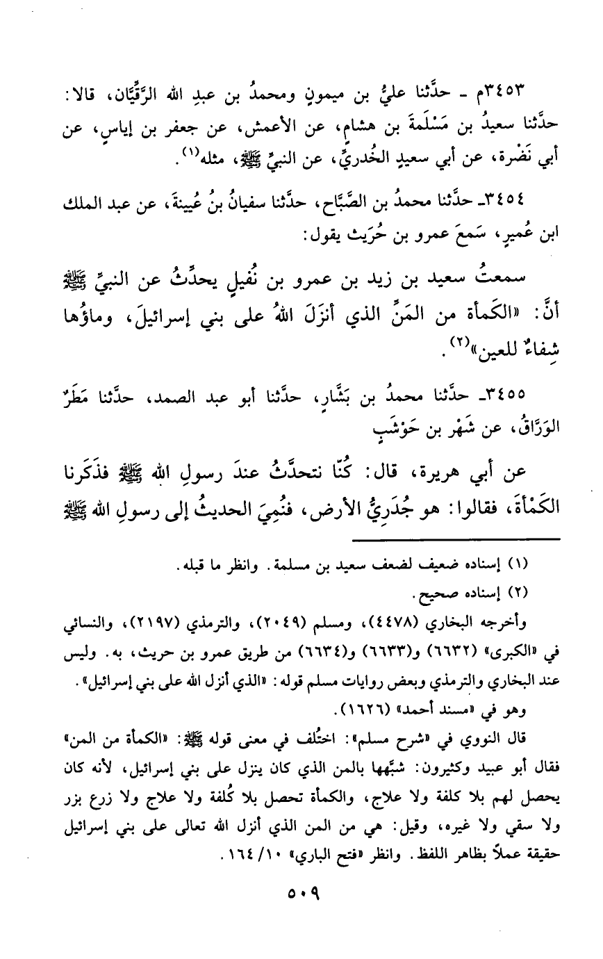 3454- حَدَّثَنَا مُحَمَّدُ بْنُ الصَّبَّاحِ ، أَخْبَرَنَا سُفْيَانُ بْنُ عُيَيْنَةَ ، عَنْ عَبْدِ الْمَلِكِ بْنِ عُمَيْرٍ ، سَمِعَ عَمْرَو بْنَ حُرَيْثٍ ، يَقُولُ : سَمِعْتُ سَعِيدَ بْنَ زَيْدِ بْنِ عَمْرِو بْنِ نُفَيْلٍ ، يُحَدِّثُ عَنِ النَّبِيِّ صَلَّى الله عَليْهِ وسَلَّمَ : أَنَّ الْكَمْأَةَ مِنَ الْمَنِّ ، الَّذِي أَنْزَلَ اللَّهُ عَلَى بَنِي إِسْرَائِيلَ وَمَاؤُهَا شِفَاءٌ لِلْعَيْنِ.