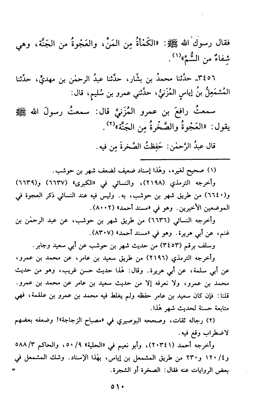 3456- حَدَّثَنَا مُحَمَّدُ بْنُ بَشَّارٍ ، حَدَّثَنَا عَبْدُ الرَّحْمَنِ بْنُ مَهْدِيٍّ ، حَدَّثَنَا الْمُشْمَعِلُّ بْنُ إِيَاسٍ الْمُزَنِيُّ , حَدَّثَنِي عَمْرُو بْنُ سُلَيْمٍ ، قَالَ سَمِعْتُ رَافِعَ بْنَ عَمْرٍو الْمُزَنِيَّ ، قَالَ : سَمِعْتُ رَسُول اللهِ صَلَّى الله عَليْهِ وسَلَّمَ يَقُولُ : الْعَجْوَةُ وَالصَّخْرَةُ ، مِنَ الْجَنَّةِ.