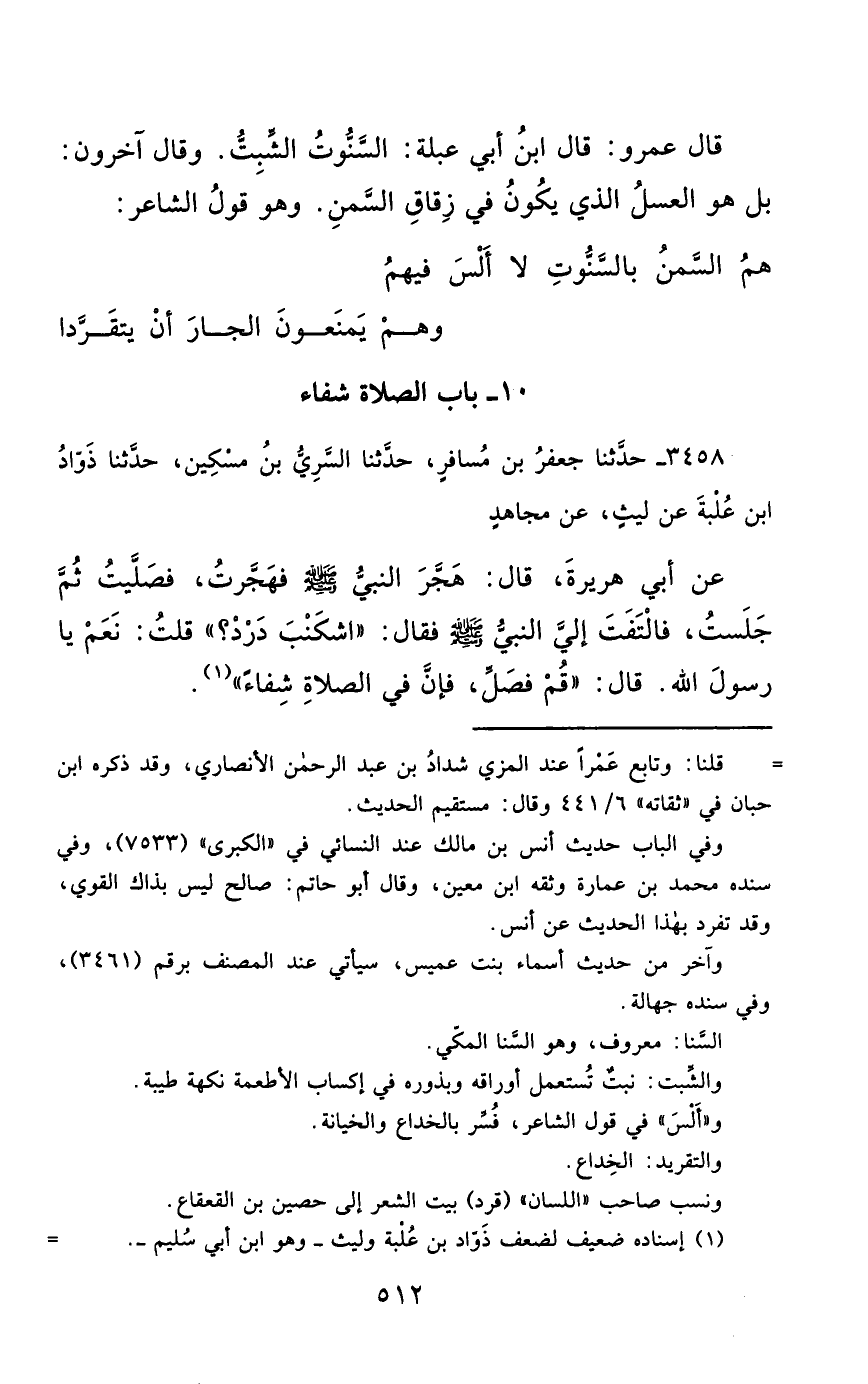 3458- حَدَّثَنَا جَعْفَرُ بْنُ مُسَافِرٍ ، حَدَّثَنَا السَّرِيُّ بْنُ مِسْكِينٍ ، حَدَّثَنَا ذَوَّادُ بْنُ عُلْبَةَ ، عَنْ لَيْثٍ ، عَنْ مُجَاهِدٍ ، عَنْ أَبِي هُرَيْرَةَ ، قَالَ : هَجَّرَ النَّبِيُّ صَلَّى الله عَليْهِ وسَلَّمَ ، فَهَجَّرْتُ ، فَصَلَّيْتُ ثُمَّ جَلَسْتُ ، فَالْتَفَتَ إِلَيَّ النَّبِيُّ صَلَّى الله عَليْهِ وسَلَّمَ ، فَقَالَ : اشِكَنِبَ دَرْدْ ؟ قُلْتُ : نَعَمْ ، يَا رَسُولَ اللهِ ، قَالَ : قُمْ فَصَلِّ ، فَإِنَّ فِي الصَّلاَةِ شِفَاءً.