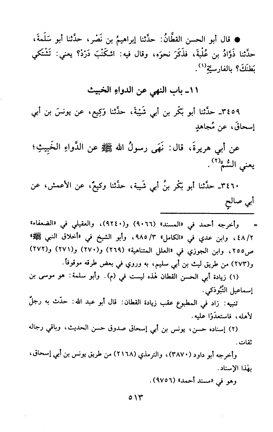3459- حَدَّثَنَا أَبُو بَكْرِ بْنُ أَبِي شَيْبَةَ ، حَدَّثَنَا وَكِيعٌ ، عَنْ يُونُسَ بْنِ أَبِي إِسْحَاقَ ، عَنْ مُجَاهِدٍ ، عَنْ أَبِي هُرَيْرَةَ ، قَالَ : نَهَى رَسُولُ اللهِ صَلَّى الله عَليْهِ وسَلَّمَ ، عَنِ الدَّوَاءِ الْخَبِيثِ ، يَعْنِي السُّمَّ.