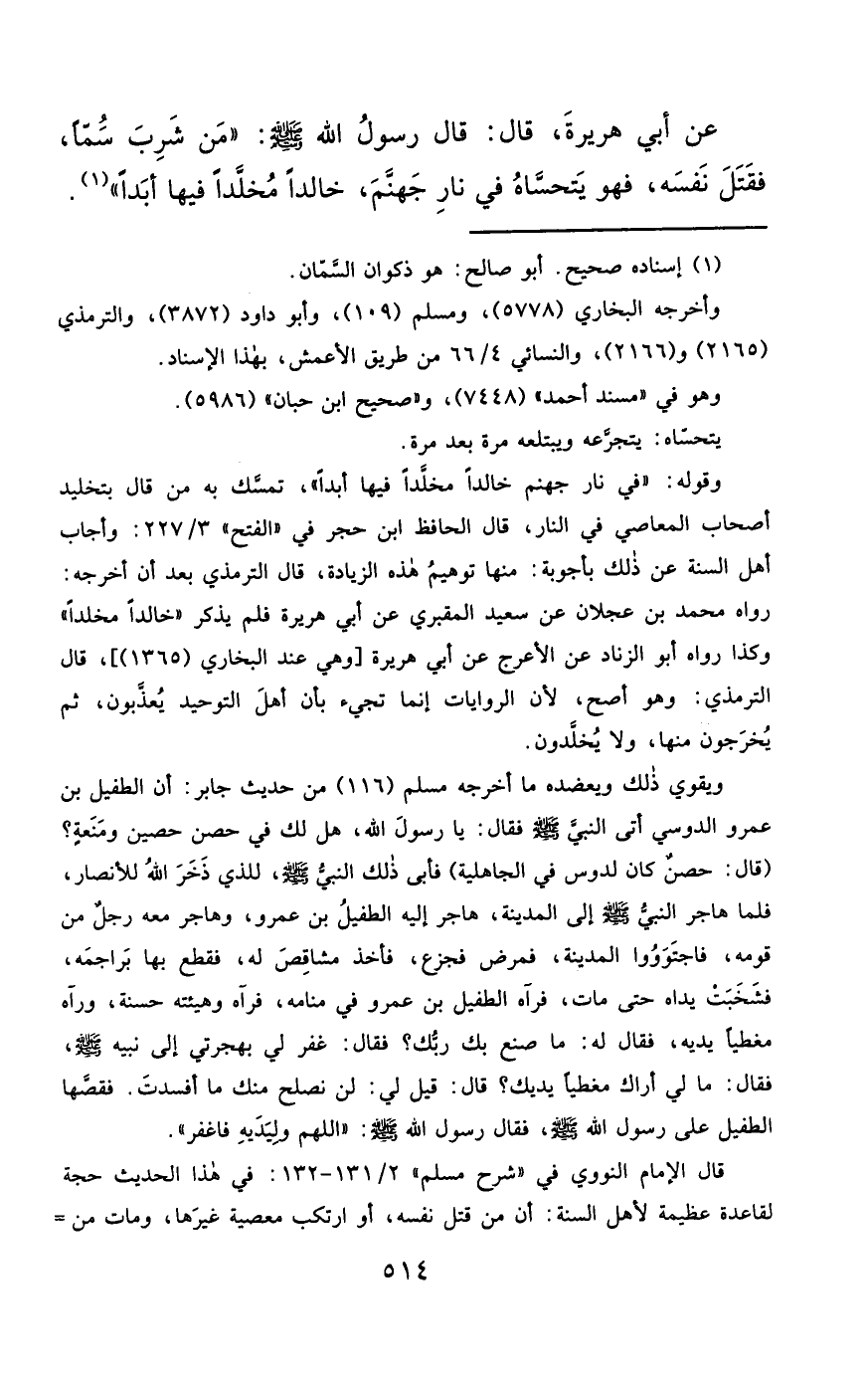 قال الإمام النووي في "شرح مسلم" 2/ 131 - 132: في هذا الحديث حجة لقاعدة عظيمة لأهل السنة: أن من قتل نفسه، أو ارتكب معصية غيرَها، ومات من =