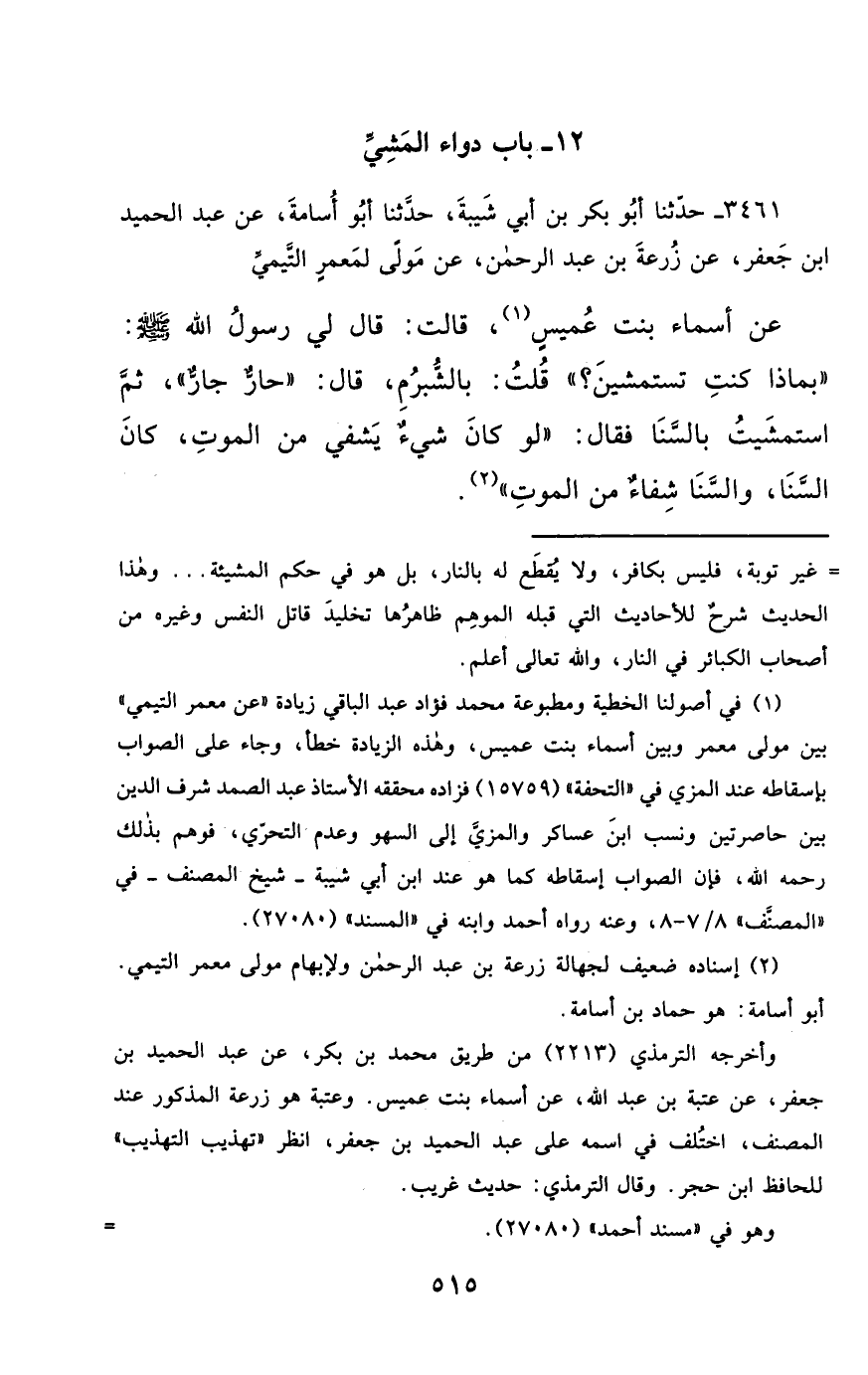 3461- حَدَّثَنَا أَبُو بَكْرِ بْنُ أَبِي شَيْبَةَ ، حَدَّثَنَا أَبُو أُسَامَةَ ، عَنْ عَبْدِ الْحَمِيدِ بْنِ جَعْفَرٍ ، عَنْ زُرْعَةَ بْنِ عَبْدِ الرَّحْمَنِ ، عَنْ مَوْلًى لِمَعْمَرٍ التَّيْمِيِّ ، عَنْ أَسْمَاءَ بِنْتِ عُمَيْسٍ ، قَالَتْ : قَالَ لِي رَسُولُ اللهِ صَلَّى الله عَليْهِ وسَلَّمَ : بِمَاذَا كُنْتِ تَسْتَمْشِينَ ؟ قُلْتُ : بِالشُّبْرُمِ ، قَالَ : حَارٌّ جَارٌّ ثُمَّ اسْتَمْشَيْتُ بِالسَّنَى فَقَالَ : لَوْ كَانَ شَيْءٌ يَشْفِي مِنَ الْمَوْتِ ، كَانَ السَّنَى ، وَالسَّنَى شِفَاءٌ مِنَ الْمَوْتِ.