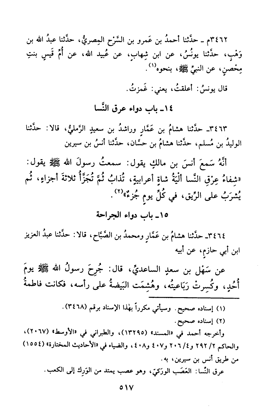 3464- حَدَّثَنَا هِشَامُ بْنُ عَمَّارٍ ، وَمُحَمَّدُ بْنُ الصَّبَّاحِ ، قَالاَ : حَدَّثَنَا عَبْدُ الْعَزِيزِ بْنُ أَبِي حَازِمٍ ، عَنْ أَبِيهِ ، عَنْ سَهْلِ بْنِ سَعْدٍ السَّاعِدِيِّ ، قَالَ : جُرِحَ رَسُولُ اللهِ صَلَّى الله عَليْهِ وسَلَّمَ ، يَوْمَ أُحُدٍ ، وَكُسِرَتْ رَبَاعِيَتُهُ ، وَهُشِمَتِ الْبَيْضَةُ عَلَى رَأْسِهِ ، فَكَانَتْ فَاطِمَةُ تَغْسِلُ الدَّمَ عَنْهُ ، وَعَلِيٌّ يَسْكِبُ عَلَيْهِ الْمَاءَ بِالْمِجَنِّ ، فَلَمَّا رَأَتْ فَاطِمَةُ أَنَّ الْمَاءَ لاَ يَزِيدُ الدَّمَ إِلاَّ كَثْرَةً أَخَذَتْ قِطْعَةَ حَصِيرٍ ، فَأَحْرَقَتْهَا ، حَتَّى إِذَا صَارَ رَمَادًا ، أَلْزَمَتْهُ الْجُرْحَ ، فَاسْتَمْسَكَ الدَّمُ.