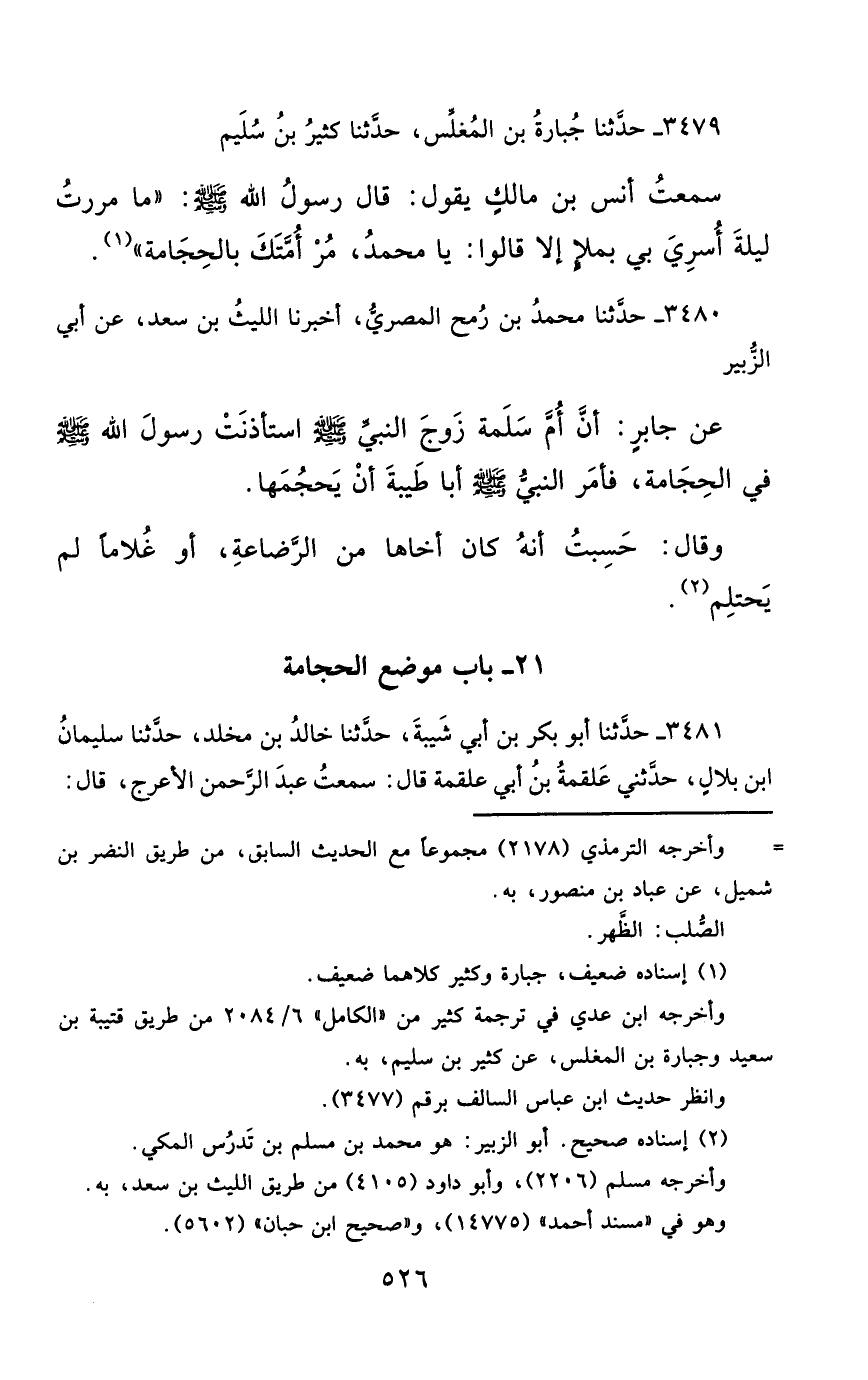 3479- حَدَّثَنَا جُبَارَةُ بْنُ الْمُغَلِّسِ ، حَدَّثَنَا كَثِيرُ بْنُ سُلَيْمٍ قَالَ : سَمِعْتُ أَنَسَ بْنَ مَالِكٍ ، يَقُولُ : قَالَ رَسُولُ اللهِ صَلَّى الله عَليْهِ وسَلَّمَ : مَا مَرَرْتُ لَيْلَةَ أُسْرِيَ بِي بِمَلَإٍ ، إِلاَّ قَالُوا : يَا مُحَمَّدُ ، مُرْ أُمَّتَكَ بِالْحِجَامَةِ.