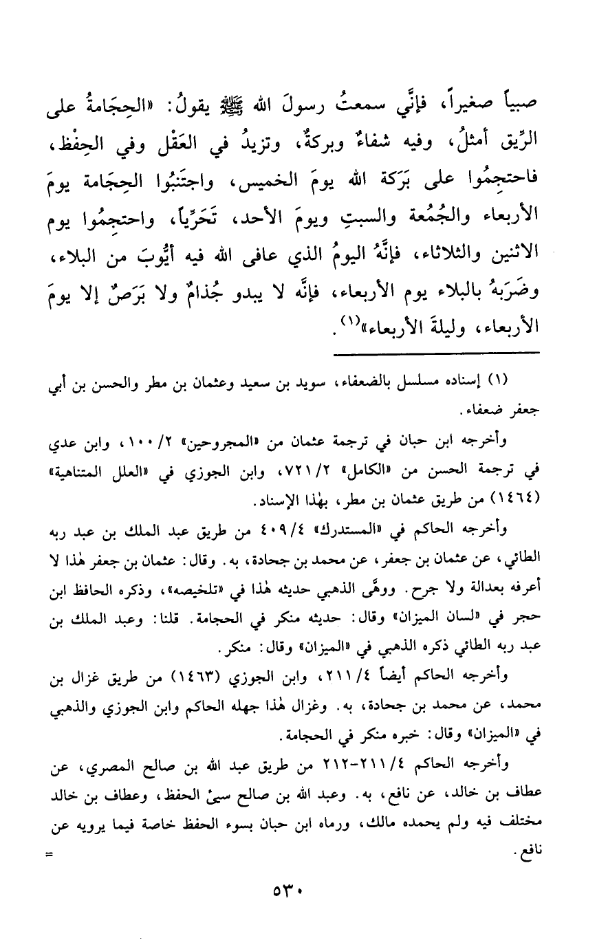 3488- حَدَّثَنَا مُحَمَّدُ بْنُ الْمُصَفَّى الْحِمْصِيُّ ، حَدَّثَنَا عُثْمَانُ بْنُ عَبْدِ الرَّحْمَنِ ، حَدَّثَنَا عَبْدُ اللهِ بْنُ عِصْمَةَ ، عَنْ سَعِيدِ بْنِ مَيْمُونٍ ، عَنْ نَافِعٍ ، قَالَ : قَالَ ابْنُ عُمَرَ : يَا نَافِعُ ، تَبَيَّغَ بِيَ الدَّمُ ، فَأْتِنِي بِحَجَّامٍ ، وَاجْعَلْهُ شَابًّا ، وَلاَ تَجْعَلْهُ شَيْخًا ، وَلاَ صَبِيًّا ، قَالَ : وَقَالَ ابْنُ عُمَرَ ، سَمِعْتُ رَسُولَ اللهِ صَلَّى الله عَليْهِ وسَلَّمَ يَقُولُ : الْحِجَامَةُ عَلَى الرِّيقِ أَمْثَلُ ، وَهِيَ تَزِيدُ فِي الْعَقْلِ ، وَتَزِيدُ فِي الْحِفْظِ ، وَتَزِيدُ الْحَافِظَ حِفْظًا ، فَمَنْ كَانَ مُحْتَجِمًا ، فَيَوْمَ الْخَمِيسِ ، عَلَى اسْمِ اللهِ ، وَاجْتَنِبُوا الْحِجَامَةَ يَوْمَ الْجُمُعَةِ ، وَيَوْمَ السَّبْتِ ، وَيَوْمَ الأَحَدِ ، وَاحْتَجِمُوا يَوْمَ الاِثْنَيْنِ ، وَالثُّلاَثَاءِ ، وَاجْتَنِبُوا الْحِجَامَةَ يَوْمَ الأَرْبِعَاءِ ، فَإِنَّهُ الْيَوْمُ الَّذِي أُصِيبَ فِيهِ أَيُّوبُ بِالْبَلاَءِ ، وَمَا يَبْدُو جُذَامٌ ، وَلاَ بَرَصٌ ، إِلاَّ فِي يَوْمِ الأَرْبِعَاءِ ، أَوْ لَيْلَةِ الأَرْبِعَاءِ.