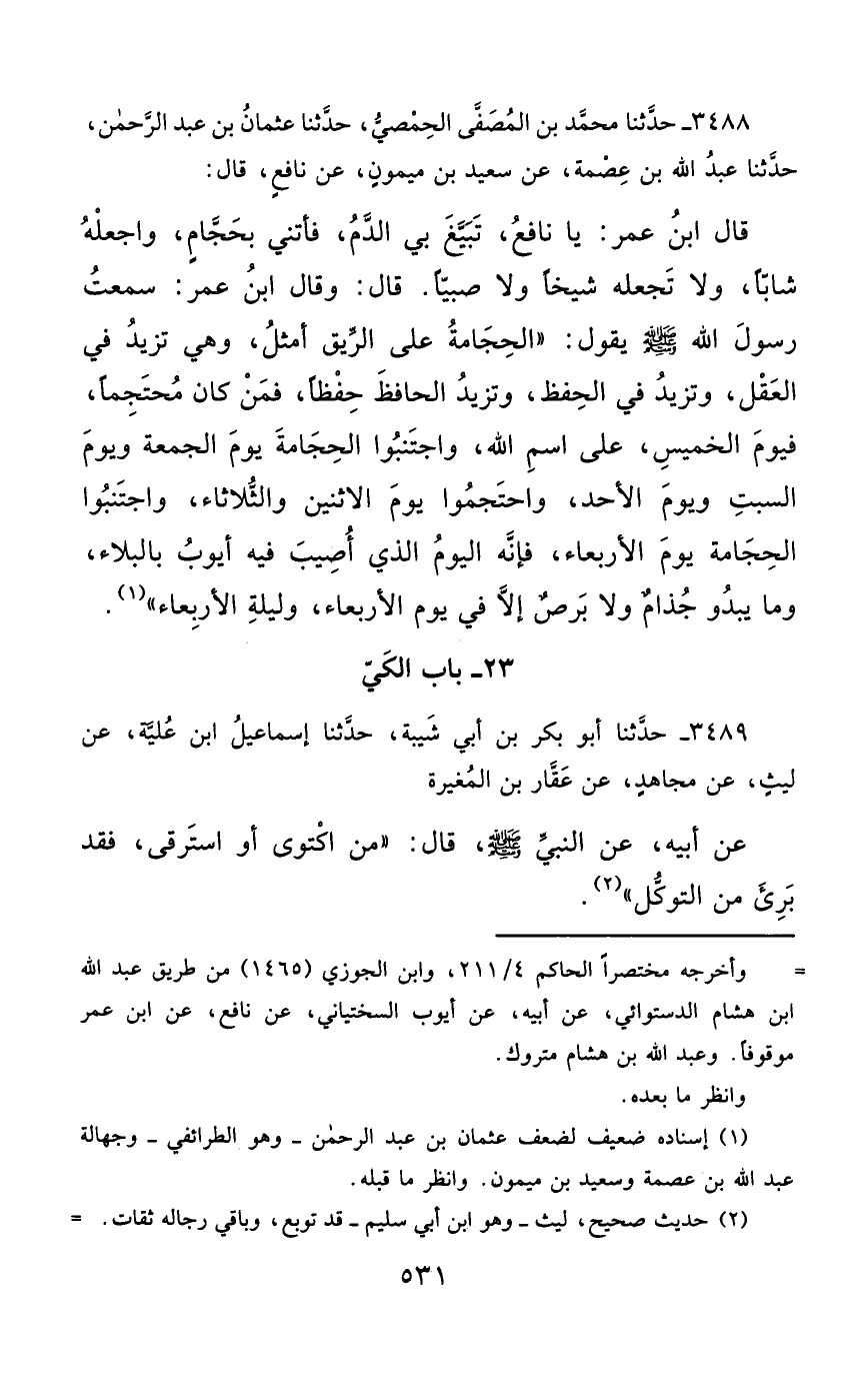 3489- حَدَّثَنَا أَبُو بَكْرِ بْنُ أَبِي شَيْبَةَ ، حَدَّثَنَا إِسْمَاعِيلُ ابْنُ عُلَيَّةَ ، عَنْ لَيْثٍ ، عَنْ مُجَاهِدٍ ، عَنْ عَقَّارِ بْنِ الْمُغِيرَةِ ، عَنْ أَبِيهِ ، عَنِ النَّبِيِّ صَلَّى الله عَليْهِ وسَلَّمَ قَالَ : مَنِ اكْتَوَى ، أَوِ اسْتَرْقَى ، فَقَدْ بَرِئَ مِنَ التَّوَكُّلِ.