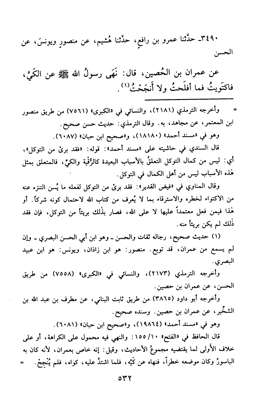 3490- حَدَّثَنَا عَمْرُو بْنُ رَافِعٍ ، حَدَّثَنَا هُشَيْمٌ ، عَنْ مَنْصُورٍ ، وَيُونُسُ ، عَنِ الْحَسَنِ ، عَنْ عِمْرَانَ بْنِ الْحُصَيْنِ ، قَالَ : نَهَى رَسُولُ اللهِ صَلَّى الله عَليْهِ وسَلَّمَ ، عَنِ الْكَيِّ ، فَاكْتَوَيْتُ ، فَمَا أَفْلَحْتُ ، وَلاَ أَنْجَحْتُ.