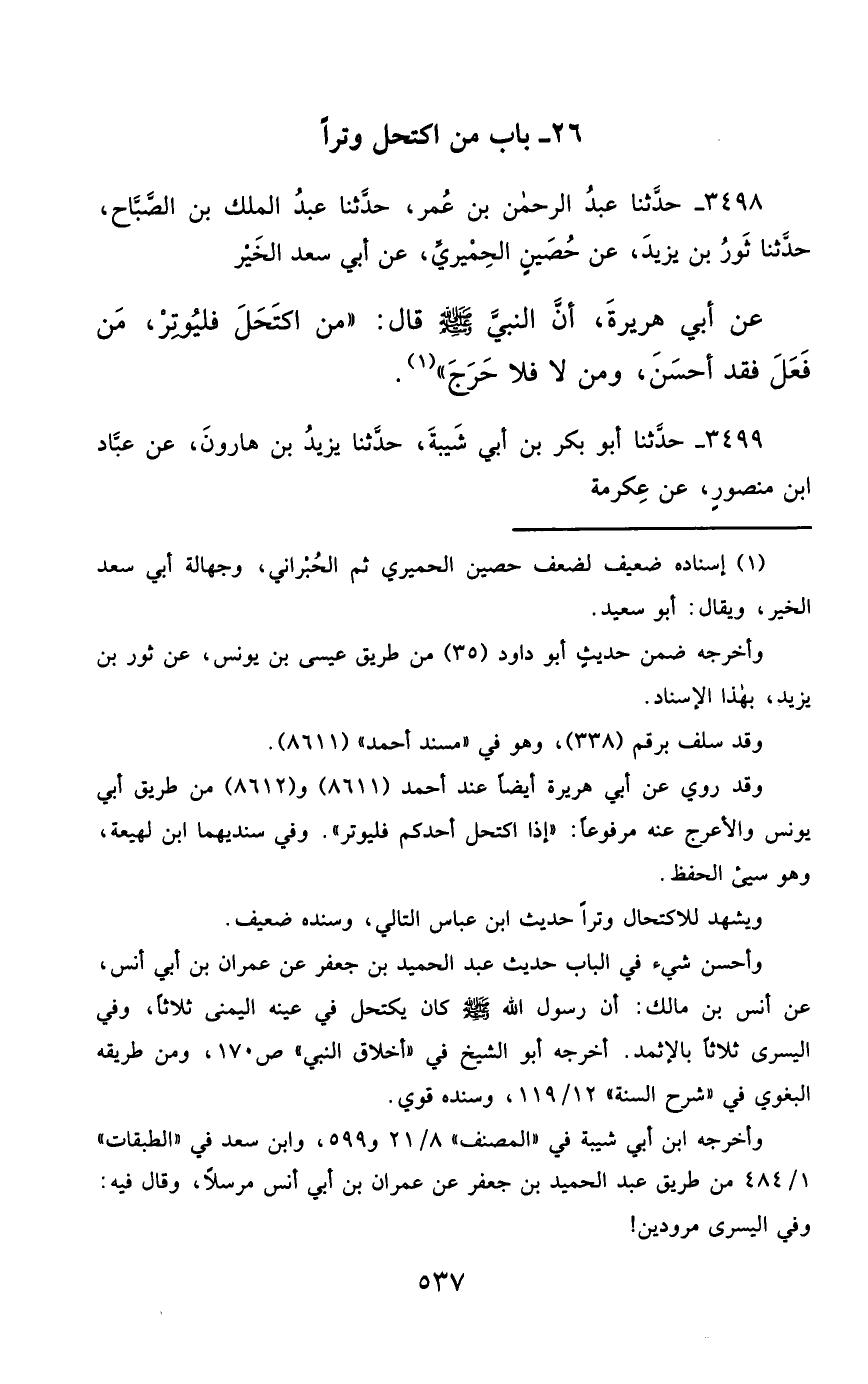 3498- حَدَّثَنَا عَبْدُ الرَّحْمَنِ بْنُ عُمَرَ ، حَدَّثَنَا عَبْدُ الْمَلِكِ بْنُ الصَّبَّاحِ ، عَنْ ثَوْرِ بْنِ يَزِيدَ ، عَنْ حُصَيْنٍ الْحِمْيَرِيِّ ، عَنْ أَبِي سَعْدِ الْخَيْرِ ، عَنْ أَبِي هُرَيْرَةَ ، أَنَّ النَّبِيَّ صَلَّى الله عَليْهِ وسَلَّمَ ، قَالَ : مَنِ اكْتَحَلَ فَلْيُوتِرْ ، مَنْ فَعَلَ ، فَقَدْ أَحْسَنَ ، وَمَنْ لاَ ، فَلاَ حَرَجَ.