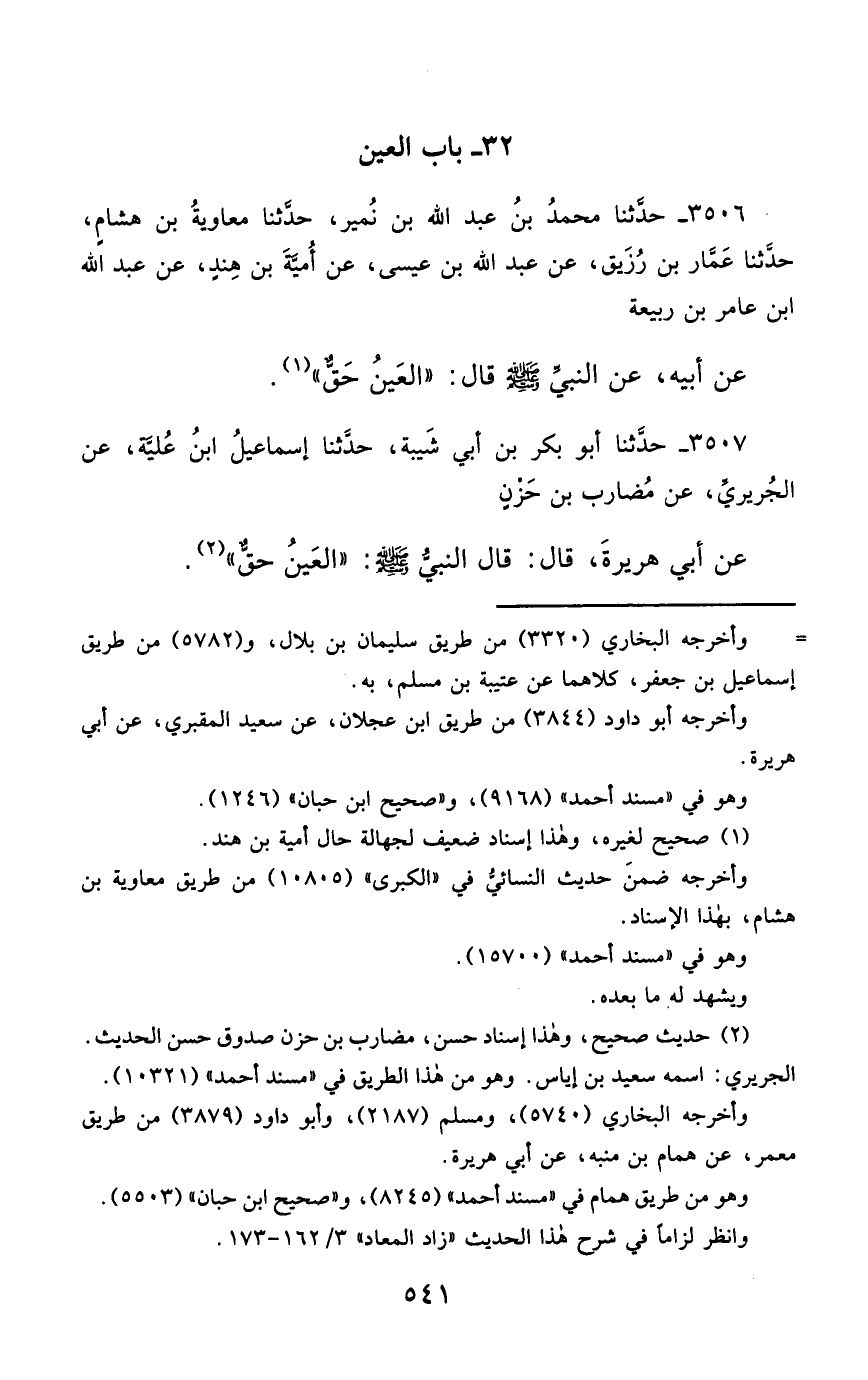3506- حَدَّثَنَا مُحَمَّدُ بْنُ عَبْدِ اللهِ بْنِ نُمَيْرٍ ، حَدَّثَنَا مُعَاوِيَةُ بْنُ هِشَامٍ ، حَدَّثَنَا عَمَّارُ بْنُ رُزَيْقٍ (1)، عَنْ عَبْدِ اللهِ بْنِ عِيسَى ، عَنْ أُمَيَّةَ بْنِ هِنْدٍ ، عَنْ عَبْدِ اللهِ بْنِ عَامِرِ بْنِ رَبِيعَةَ ، عَنْ أَبِيهِ ، عَنِ النَّبِيِّ صَلَّى الله عَليْهِ وسَلَّمَ ، قَالَ : الْعَيْنُ حَقٌّ.