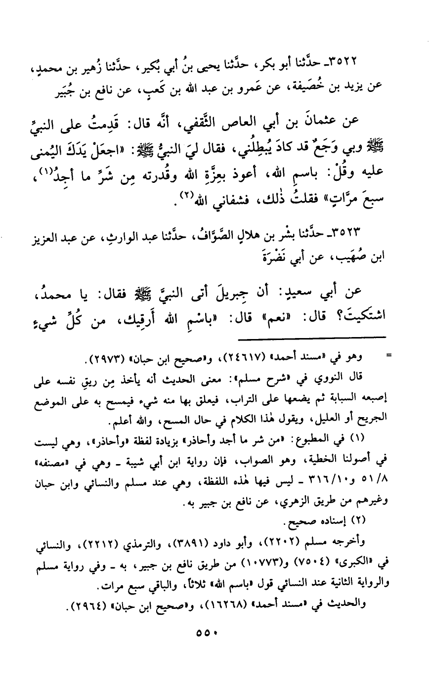 3522- حَدَّثَنَا أَبُو بَكْرٍ ، حَدَّثَنَا يَحْيَى بْنُ أَبِي بُكَيْرٍ ، حَدَّثَنَا زُهَيْرُ بْنُ مُحَمَّدٍ ، عَنْ يَزِيدَ بْنِ خُصَيْفَةَ ، عَنْ عَمْرِو بْنِ عَبْدِ اللهِ بْنِ كَعْبٍ ، عَنْ نَافِعِ بْنِ جُبَيْرٍ ، عَنْ عُثْمَانَ بْنِ أَبِي الْعَاصِ الثَّقَفِيِّ ، أَنَّهُ قَالَ : قَدِمْتُ عَلَى النَّبِيِّ صَلَّى الله عَليْهِ وسَلَّمَ ، وَبِي وَجَعٌ ، قَدْ كَادَ يُبْطِلُنِي ، فَقَالَ لِي النَّبِيُّ صَلَّى الله عَليْهِ وسَلَّمَ : اجْعَلْ يَدَكَ الْيُمْنَى عَلَيْهِ ، وَقُلْ بِسْمِ اللهِ أَعُوذُ بِعِزَّةِ اللهِ وَقُدْرَتِهِ , مِنْ شَرِّ مَا أَجِدُ وَأُحَاذِرُ ، سَبْعَ مَرَّاتٍ ، فَقُلْتُ ذَلِكَ ، فَشَفَانِيَ اللَّهُ.