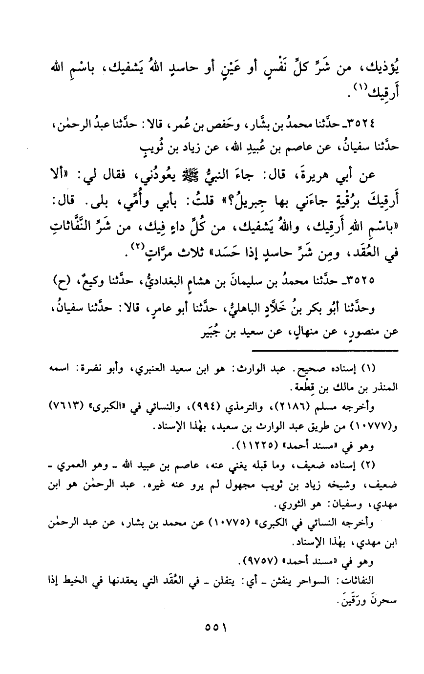 3524- حَدَّثَنَا مُحَمَّدُ بْنُ بَشَّارٍ ، وَحَفْصُ بْنُ عَمْرٍو ، قَالاَ : حَدَّثَنَا عَبْدُ الرَّحْمَنِ ، حَدَّثَنَا سُفْيَانُ ، عَنْ عَاصِمِ بْنِ عُبَيْدِ اللهِ ، عَنْ زِيَادِ بْنِ ثُوَيْبٍ ، عَنْ أَبِي هُرَيْرَةَ ، قَالَ : جَاءَ النَّبِيُّ صَلَّى الله عَليْهِ وسَلَّمَ يَعُودُنِي ، فَقَالَ لِي أَلاَ أَرْقِيكَ بِرُقْيَةٍ جَاءَنِي بِهَا جِبْرَائِيلُ ؟ قُلْتُ : بِأَبِي ، وَأُمِّي بَلَى يَا رَسُولَ اللهِ ، قَالَ : بِسْمِ اللهِ أَرْقِيكَ ، وَاللَّهُ يَشْفِيكَ ، مِنْ كُلِّ دَاءٍ فِيكَ ، مِنْ شَرِّ النَّفَّاثَاتِ فِي الْعُقَدِ ، وَمِنْ شَرِّ حَاسِدٍ إِذَا حَسَدَ ثَلاَثَ مَرَّاتٍ.
