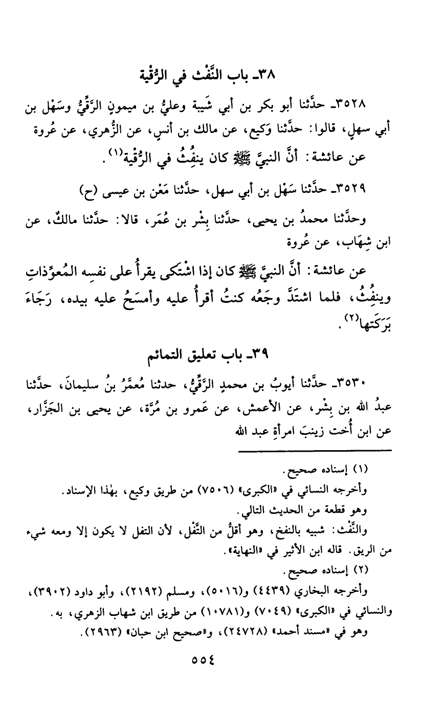 3528- حَدَّثَنَا أَبُو بَكْرِ بْنُ أَبِي شَيْبَةَ ، وَعَلِيُّ بْنُ مَيْمُونٍ الرَّقِّيُّ ، وَسَهْلُ بْنُ أَبِي سَهْلٍ قَالُوا : حَدَّثَنَا وَكِيعٌ ، عَنْ مَالِكِ بْنِ أَنَسٍ ، عَنِ الزُّهْرِيِّ ، عَنْ عُرْوَةَ ، عَنْ عَائِشَةَ ، أَنَّ النَّبِيَّ صَلَّى الله عَليْهِ وسَلَّمَ : كَانَ يَنْفُثُ فِي الرُّقْيَةِ.