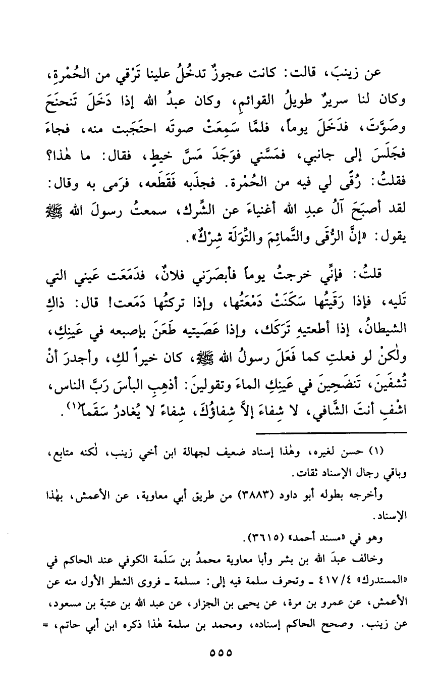 عَنْ زَيْنَبَ، قَالَتْ: كَانَتْ عَجُوزٌ تَدْخُلُ عَلَيْنَا تَرْقِي مِنْ الْحُمْرَةِ، وَكَانَ لَنَا سَرِيرٌ طَوِيلُ الْقَوَائِمِ، وَكَانَ عَبْدُ اللَّهِ إِذَا دَخَلَ تَنَحْنَحَ وَصَوَّتَ، فَدَخَلَ يَوْمًا، فَلَمَّا سَمِعَتْ صَوْتَهُ احْتَجَبَتْ مِنْهُ، فَجَاءَ فَجَلَسَ إِلَى جَانِبِي، فَمَسَّنِي فَوَجَدَ مَسَّ خَيْطٍ، فَقَالَ: مَا هَذَا؟ فَقُلْتُ: رُقًى لِي فِيهِ مِنْ الْحُمْرَةِ. فَجَذَبَهُ فقَطَعَهُ، فَرَمَى بِهِ وَقَالَ: لَقَدْ أَصْبَحَ آلُ عَبْدِ اللَّهِ أَغْنِيَاءَ عَنْ الشِّرْكِ، سَمِعْتُ رَسُولَ اللَّهِ - صَلَّى اللَّهُ عَلَيْهِ وَسَلَّمَ - يَقُولُ: "إِنَّ الرُّقَى وَالتَّمَائِمَ وَالتِّوَلَةَ شِرْكٌ".