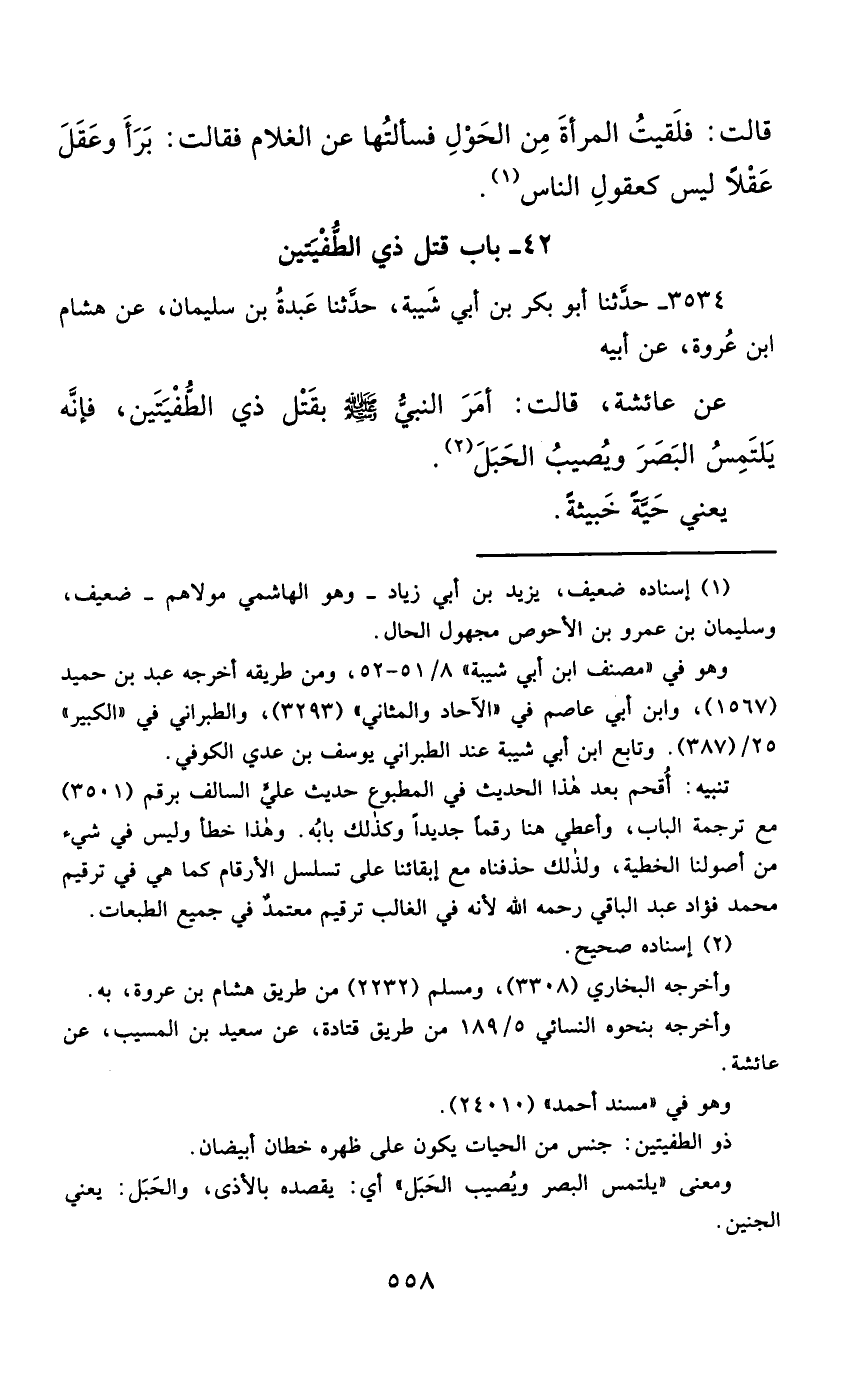 3534- حَدَّثَنَا أَبُو بَكْرِ بْنُ أَبِي شَيْبَةَ ، حَدَّثَنَا عَبْدَةُ بْنُ سُلَيْمَانَ ، عَنْ هِشَامِ بْنِ عُرْوَةَ ، عَنْ أَبِيهِ ، عَنْ عَائِشَةَ قَالَتْ : أَمَرَ النَّبِيُّ صَلَّى الله عَليْهِ وسَلَّمَ بِقَتْلِ ذِي الطُّفْيَتَيْنِ ، فَإِنَّهُ يَلْتَمِسُ الْبَصَرَ ، وَيُصِيبُ الْحَبَلَ.