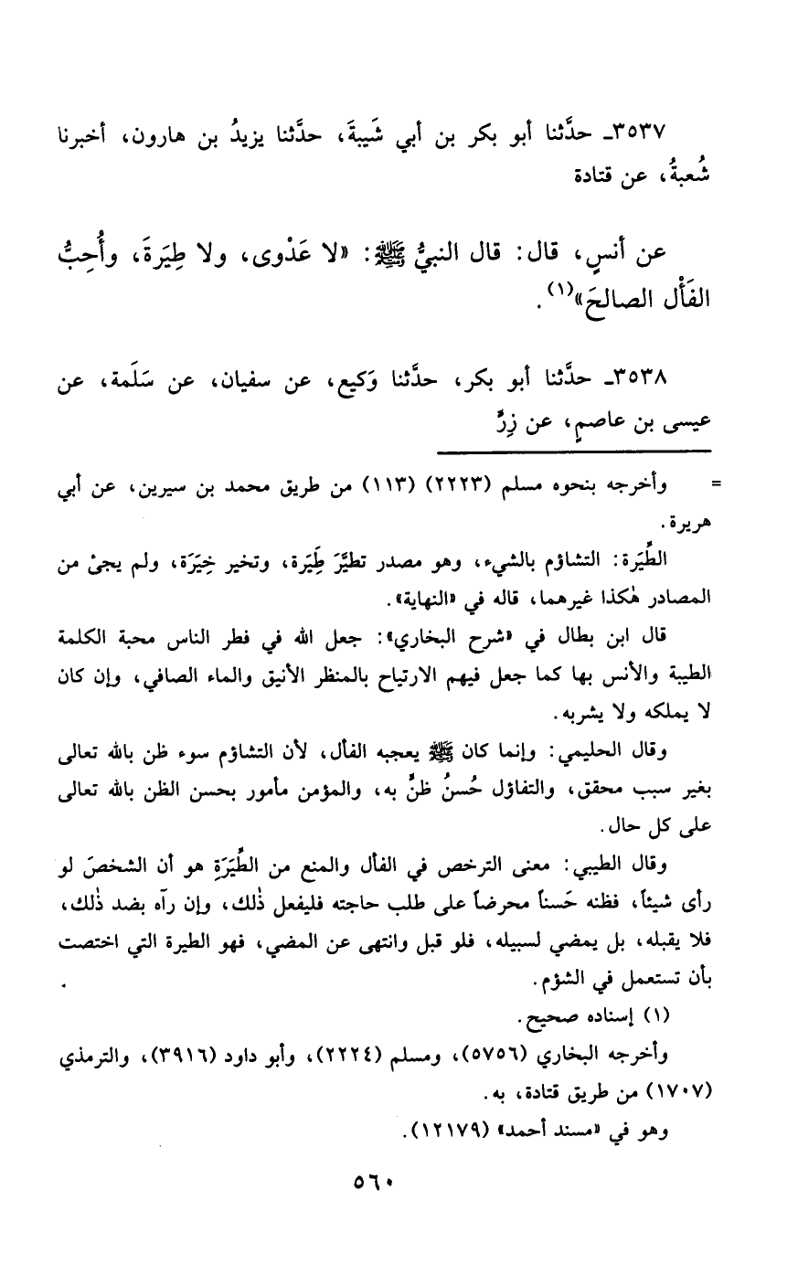 3537- حَدَّثَنَا أَبُو بَكْرِ بْنُ أَبِي شَيْبَةَ ، حَدَّثَنَا يَزِيدُ بْنُ هَارُونَ ، أَخْبَرَنَا شُعْبَةُ ، عَنْ قَتَادَةَ ، عَنْ أَنَسٍ قَالَ : قَالَ النَّبِيُّ صَلَّى الله عَليْهِ وسَلَّمَ : لاَ عَدْوَى ، وَلاَ طِيَرَةَ ، وَأُحِبُّ الْفَأْلَ الصَّالِحَ.