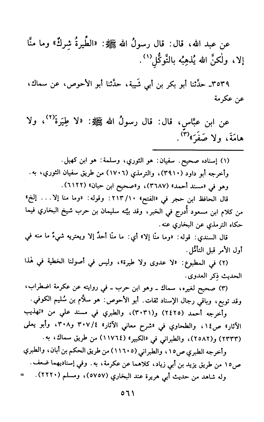 3539- حَدَّثَنَا أَبُو بَكْرِ بْنُ أَبِي شَيْبَةَ ، حَدَّثَنَا أَبُو الأَحْوَصِ ، عَنْ سِمَاكٍ ، عَنْ عِكْرِمَةَ ، عَنِ ابْنِ عَبَّاسٍ قَالَ : قَالَ رَسُولُ اللهِ صَلَّى الله عَليْهِ وسَلَّمَ : لاَ عَدْوَى ، وَلاَ طِيَرَةَ ، وَلاَ هَامَةَ ، وَلاَ صَفَرَ.