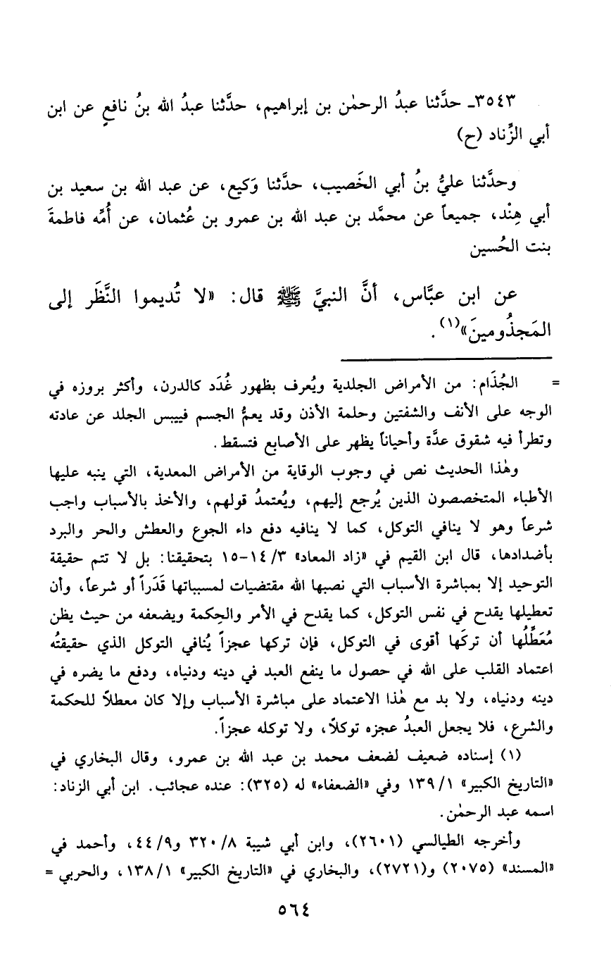 3543- حَدَّثَنَا عَبْدُ الرَّحْمَنِ بْنُ إِبْرَاهِيمَ ، حَدَّثَنَا عَبْدُ اللهِ بْنُ نَافِعٍ ، عَنِ ابْنِ أَبِي الزِّنَادِ (ح) وحَدَّثَنَا عَلِيُّ بْنُ أَبِي الْخَصِيبِ ، حَدَّثَنَا وَكِيعٌ ، عَنْ عَبْدِ اللهِ بْنِ سَعِيدِ بْنِ أَبِي هِنْدٍ ؛ جَمِيعًا عَنْ مُحَمَّدِ بْنِ عَبْدِ اللهِ بْنِ عَمْرِو بْنِ عُثْمَانَ ، عَنْ أُمِّهِ فَاطِمَةَ بِنْتِ الْحُسَيْنِ ، عَنِ ابْنِ عَبَّاسٍ ، أَنَّ النَّبِيَّ صَلَّى الله عَليْهِ وسَلَّمَ قَالَ : لاَ تُدِيمُوا النَّظَرَ إِلَى الْمَجْذُومِينَ.