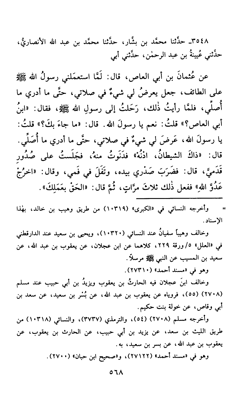 3548- حَدَّثَنَا مُحَمَّدُ بْنُ بَشَّارٍ ، حَدَّثَنَا مُحَمَّدُ بْنُ عَبْدِ اللهِ الأَنْصَارِيُّ , حَدَّثَنِي عُيَيْنَةُ بْنُ عَبْدِ الرَّحْمَنِ , حَدَّثَنِي أَبِي ، عَنْ عُثْمَانَ بْنِ أَبِي الْعَاصِ قَالَ : لَمَّا اسْتَعْمَلَنِي رَسُولُ اللهِ صَلَّى الله عَليْهِ وسَلَّمَ عَلَى الطَّائِفِ جَعَلَ يَعْرِضُ لِي شَيْءٌ فِي صَلاَتِي حَتَّى مَا أَدْرِي مَا أُصَلِّي ، فَلَمَّا رَأَيْتُ ذَلِكَ رَحَلْتُ إِلَى رَسُولِ اللهِ صَلَّى الله عَليْهِ وسَلَّمَ فَقَالَ : ابْنُ أَبِي الْعَاصِ ؟ قُلْتُ : نَعَمْ يَا رَسُولَ اللهِ ، قَالَ : مَا جَاءَ بِكَ ؟ قُلْتُ : يَا رَسُولَ اللهِ ، عَرَضَ لِي شَيْءٌ فِي صَلَوَاتِي حَتَّى مَا أَدْرِي مَا أُصَلِّي قَالَ : ذَاكَ الشَّيْطَانُ , ادْنُهْ فَدَنَوْتُ مِنْهُ ، فَجَلَسْتُ عَلَى صُدُورِ قَدَمَيَّ ، قَالَ : فَضَرَبَ صَدْرِي بِيَدِهِ ، وَتَفَلَ فِي فَمِي وَقَالَ : اخْرُجْ عَدُوَّ اللهِ فَفَعَلَ ذَلِكَ ثَلاَثَ مَرَّاتٍ ، ثُمَّ قَالَ : الْحَقْ بِعَمَلِكَ.