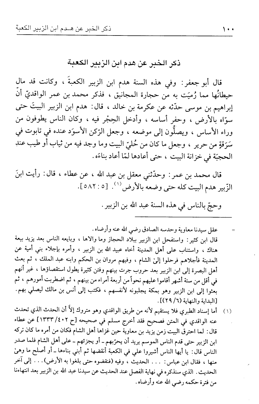 (١) أما إسناد الطبري فلا يستقيم لأنه من طريق الواقدي وهو متروك إلَّا أن الحدث الذي تحدث عنه الواقدي في المتن فصحيح فقد أخرج مسلم في صحيحه [ح ٤٠٢/ ١٣٣٣] عن عطاء قال: لما احترق البيت زمن يزيد بن معاوية حين غزاها أهل الشام فكان من أمره ما كان تركه ابن الزبير حتى قدم الناس الموسم يريد أن يحرّبهم -أو يجزئهم- على أهل الشام فلما صدر الناس قال: يا أيها الناس أشيروا علي في الكعبة أنقضها ثم أبني بناءها -أو أصلح ما وهي منها، فقال ابن عباس: ... الحديث، وفيه (فنقضوه حتى بلغوا به الأرض) ... إلى آخر الحديث. الذي سنذكره في نهاية الفصل عند الحديث عن سيدنا عبد الله بن الزبير بعد انتهاءنا من فترة حكمه رضي الله عنه وأرضاه.