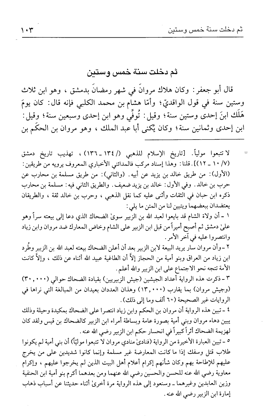 ٢ - وأن مروان سار يريد البيعة لابن الزبير بعد أن أعلن الضحاك بيعته لعبد الله بن الزبير وطُرد ابن زياد من العراق وبنو أمية من الحجاز إلَّا أن الطاغية عبيد الله أثناه عن ذلك، وإلَّا كانت الأمة تتجه نحو الاجتماع على ابن الزبير والله أعلم.