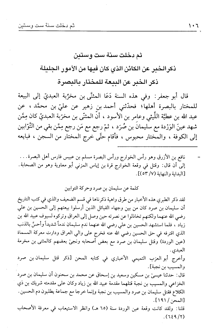 لقد ذكر الطبري هذه الأخبار من طرق واهية ذكرناها في قسم الضعيف والذي في كتب التاريخ أن سليمان بن صرد كان من بين وجهاء القبائل الذين أرسلوا بيعتهم إلى الحسين بن علي رضي الله عنهما ولكنهم تخاذلوا عن نصرته حين وصل إلى العراق وتركوه لسيوف عبيد الله بن زياد، فلما استشهد الحسين بن علي رضي الله عنهما ندم سليمان ندمًا شديدًا وأحسَّ بالذنب الذي اقترفه في حق الحسين رضي الله عنه فخرج على والي العراق ودارت معركة المسماة (عين الوردة) وقتل سليمان بن صرد مع بعض أصحابه ونجى بعضهم كالمثنى بن مخرمة العبدي.