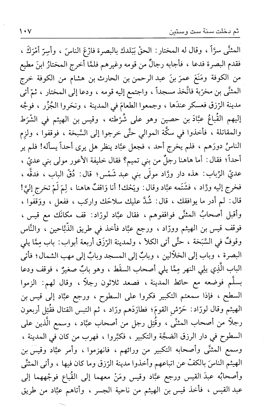 المثنَّى سرًّا، وقال له المختار: الحقْ بَبَلدك بالبصرة فارْعَ الناسَ، وأسِرّ أمْرَكَ، فقدم البصرة فدعا، فأجابه رجالٌ من قومه وغيرهم فلمَّا أخرج المختارُ ابنَ مطيع من الكوفة ومَنَعَ عمرَ بنَ عبد الرحمن بن الحارث بن هشام من الكوفة خرج المثنَّى بن مخرّبة فاتَّخذ مسجدًا، واجتمع إليه قومه، ودعا إلى المختار، ثمّ أتى مدينة الرّزق فعسكر عندَها، وجمعوا الطعامَ في المدينة، ونحَروا الجُزُر، فوجَّه إليهم القُباعُ عبَّادَ بن حصين وهو على شُرْطته، وقيس بن الهيثم في الشّرَط والمقاتلة، فأخذوا في سكَّة الموالي حتَّى خرجوا إلى السَّبخة، فوقفوا، ولزِم الناسُ دورَهم، فلم يخرج أحد، فجعل عبَّاد ينظر هل يرى أحدًا يسأله! فلم ير أحدًا؛ فقال: أما هاهنا رجلٌ من بني تميم؟ فقال خليفة الأعور مولى بني عديّ، عديّ الرِّباب: هذه دار ورَّاد مولَى بني عبد شَمْس؛ قال: دُقّ الباب، فدقَّه، فخرج إليه ورَّاد، فشَتَمه عبَّاد وقال: ويَحْك! أنا وَاقفٌ هاهنا، لِمَ لَمْ تخرج إليَّ! قال: لم أدر ما يوافقك، قال: شُدَّ عليك سلاحَك واركب، ففعل، ووَقفَوا، وأقبل أصحابُ المثنَّى فواقفوهم، فقال عبَّاد لورّاد: قف مكانَك مع قيس، فوقف قيس بن الهيثم وورّاد، ورجع عبَّاد فأخذ في طريق الذّبَّاحين، والنَّاس وقوفٌ في السَّبَخة، حتَّى أتى الكلأ، ولمدينة الرّزَق أربعة أبواب: باب مِمَّا يلي البصرة، وباب إلى الخلّالين، وبابٌ إلى المسجد وبابٌ إلى مهب الشمال؛ فأتى الباب الَّذِي يلِي النهر مِمَّا يلي أصحاب السقَط، وهو بابٌ صغيرٌ، فوقف ودعا بسلَّم فوضعه مع حائط المدينة، فصعد ثلاثون رجلًا، وقال لهم: الزموا السطح، فإذا سمعتم التكبير فكروا على السطوح، ورجع عبَّاد إلى قيس بن الهيثم وقال لورّاد: حَرّشِ القومَ؛ فطارَدَهم ورّاد، ثم التبس القتال فقُتِل أربعون رجلًا من أصحاب المثنَّى، وقُتِل رجل من أصحاب عبَّاد، وسمع الَّذين على السطوح في دار الرزق الضجَّة والتكبير، فكبَّروا، فهرب من كان في المدينة، وسمع المثنَّى وأصحابه التكبير من ورائهم، فانهزموا، وأمر عبَّاد وقيس بن الهيثم الناسَ بالكفّ عن اتباعهم وأخذوا مدينة الرّزق وما كان فيها، وأتى المثنَّى وأصحابُه عبدَ القيس ورجع عبَّاد وقيس ومَنْ معهما إلى القُباع فوجّههما إلى عبد القيس، فأخذ قيس بن الهيثم من ناحية الجسر، وأتاهم عبَّاد من طريق