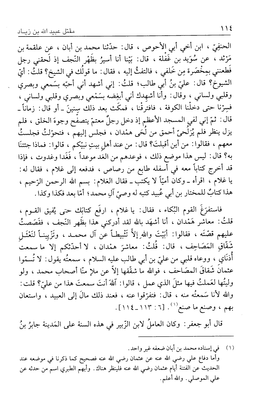 الحنفِيّ، ابن أخي أبي الأحوص، قال: حدَّثنا محمد بن أبان، عن علقمة بن مَرْثد، عن سُوَيد بن غَفْلة، قال: بَينا أنا أسيرُ بظهْر النّجف إذ لَحقني رجل فَطعنني بمِخْصَرة مِن خَلفي، فالتفتُّ إليه، فقال: ما قولُك في الشيخ؟ قلتُ: أيّ الشيوخ؟ قال: عليّ بن أبي طالب؛ قلتُ: إني أشهد أني أحبّه بسَمعي وبصري وقلبي ولساني، وقال: وأنا أشهِدك أني أبغِضه بسَمْعي وبصري وقلبي ولساني، فسِرْنا حتى دخلْنا الكوفة، فافترقْنا، فمكَث بعد ذلك سِنينَ -أو قال: زمانًا- قال: ثمّ إني لفي المسجد الأعظم إذ دخل رجلٌ معتمّ يتصفح وجوهَ الخلق، فلم يزل ينظر فلم يُرَ لُحىً أحمق من لُحَى همْدان، فجلس إليهم، فتحوّلتُ فجلستُ معهم، فقالوا: من أين أقبلتَ؟ قال: من عند أهلِ بيتِ نبيّكم، قالوا: فماذا جئتنَا به؟ قال: ليس هذا موضع ذلك، فوعدهم من الغد موعدًا، فَغَدا وغدوت، فإذا قد أخرج كتابًا معه في أسفله طابع من رصاص، فدفعه إلى غلام، فقال له: يا غلام، اقرأه -وكان أميًّا لا يكتب- فقال الغلام: بسم الله الرحمن الرّحيم، هذا كتابٌ للمختار بن أبي عُبيد كتبه له وصيّ آلِ محمد؛ أمّا بعد فكذا وكذا.