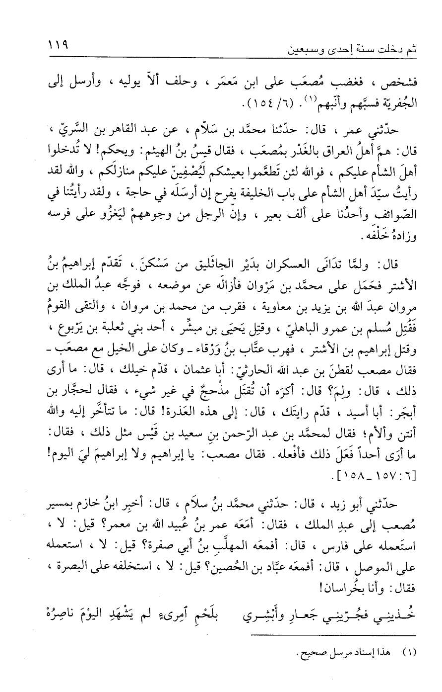 حدّثني أبو زيد، قال: حدّثني محمَّد بن سلام، قال: أخبِر ابنُ خازم بمسير مُصعب إلى عبد الملك، فقال: أمَعَه عمر بن عُبيد الله بن معمر؟ قيل: لا، استَعمله على فارس، قال: أفمعَه المهلَّبِ بن أبي صفرة؟ قيل: لا، استعمله على الموصل، قال: أفمعَه عبَّاد بن الحُصين؟ قيل: لا، استخلفه على البصرة، فقال: وأنا بخُراسان!