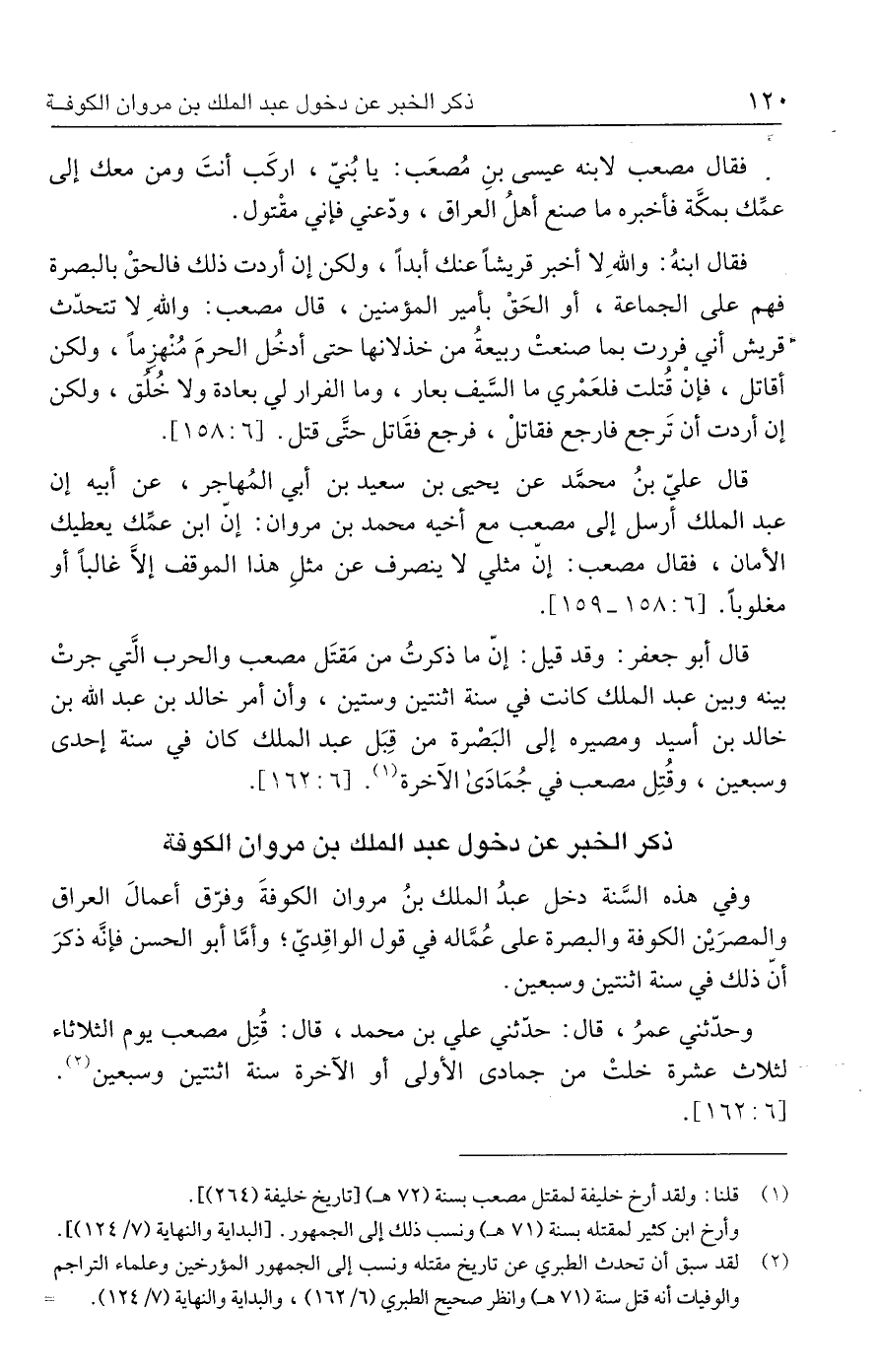 وحدّثني عمرُ، قال: حدّثني علي بن محمد، قال: قُتِل مصعب يوم الثلاثاء لثلاث عشرة خلتْ من جمادى الأولى أو الآخرة سنة اثنتين وسبعين (٢). [٦: ١٦٢].