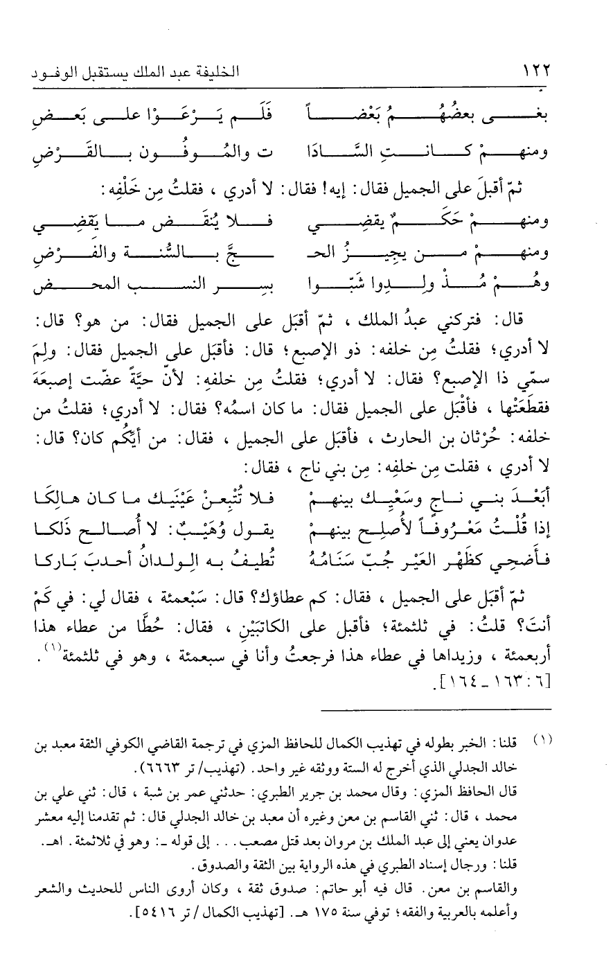 ثمّ أقبَل على الجميل، فقال: كم عطاؤك؟ قال: سَبْعمئة، فقال لي: في كَمْ أنتَ؟ قلتُ: في ثلثمئة؛ فأقبل على الكاتبَينِ، فقال: حُطَّا من عطاء هذا أربعمئة، وزيداها في عطاء هذا فرجعتُ وأنا في سبعمئة، وهو في ثلثمئة (١). [٦: ١٦٣ - ١٦٤].