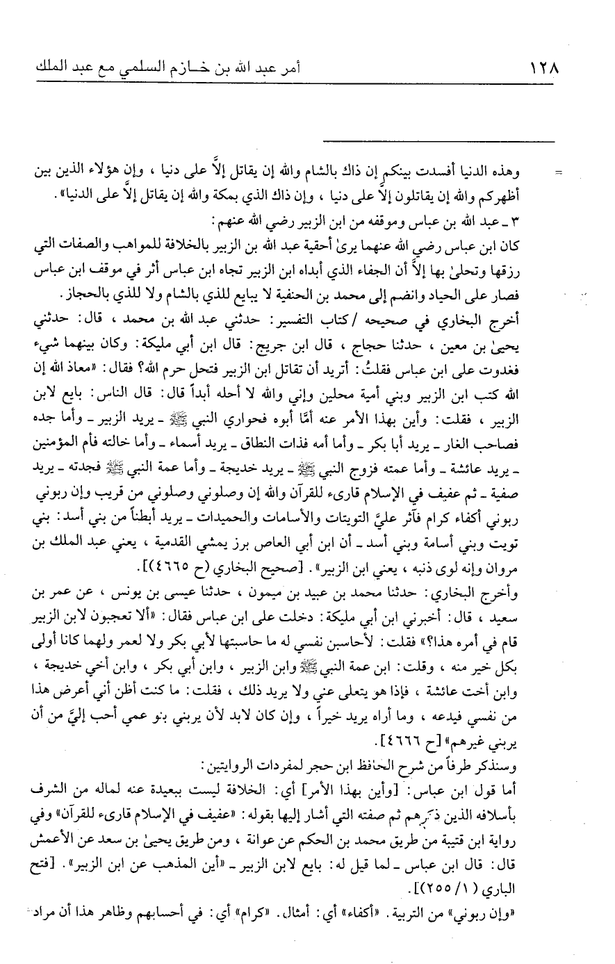 وأخرج البخاري: حدثنا محمد بن عبيد بن ميمون، حدثنا عيسى بن يونس، عن عمر بن سعيد، قال: أخبرني ابن أبي مليكة: دخلت على ابن عباس فقال: "ألا تعجبون لابن الزبير قام في أمره هذا؟ " فقلت: لأحاسبن نفسي له ما حاسبتها لأبي بكر ولا لعمر ولهما كانا أولى بكل خير منه، وقلت: ابن عمة النبي - صلى الله عليه وسلم - وابن الزبير، وابن أبي بكر، وابن أخي خديجة، وابن أخت عائشة، فإذا هو يتعلى عني ولا يريد ذلك، فقلت: ما كنت أظن أني أعرض هذا من نفسي فيدعه، وما أراه يريد خيرًا، وإن كان لا بد لأن يربني بنو عمي أحب إليَّ من أن يربني غيرهم" [ح ٤٦٦٦].