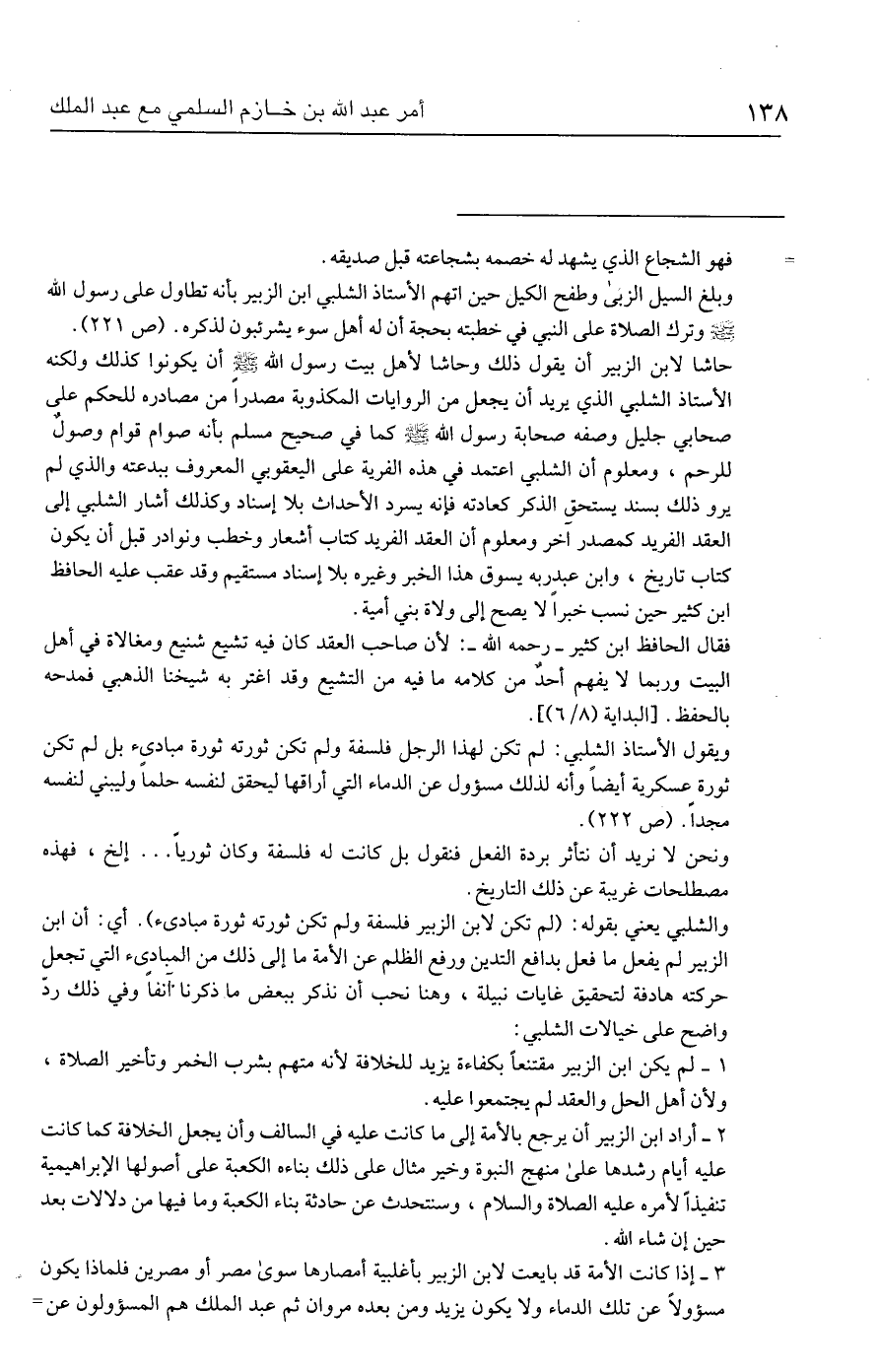 وبلغ السيل الزبى وطفح الكيل حين اتهم الأستاذ الشلبي ابن الزبير بأنه تطاول على رسول الله - صلى الله عليه وسلم - وترك الصلاة على النبي في خطبته بحجة أن له أهل سوء يشرئبون لذكره. (ص ٢٢١).