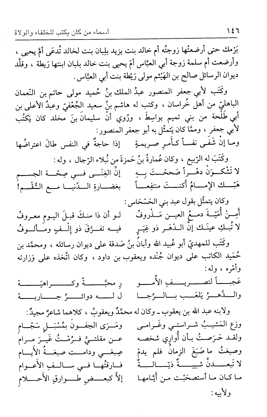 وكَتَب لأبي جعفر المنصور عبدُ الملك بن حُميد مولى حاتم بن النعمان الباهليّ من أهل خُراسان، وكتب له هاشم بن سعيد الجُعْفيّ وعبدُ الأعلى بن أبي طَلْحة من بني تميم بواسِطَ، ورُوي أن سليمانَ بنَ مخلد كان يَكتُب لأبي جعفر، وممَّا كان يَتمثّل به أبو جعفر المنصور: