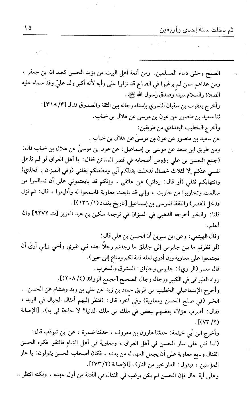 وأخرج الإسماعيلي الخطيب من طريق حماد بن زيد عن علي بن زيد وهشام عن الحسن .. الخبر (في صلح الحسن ومعاوية) وفي آخره قال: (فنظر إليهم أمثال الجبال في الربد، فقال: أضرب هؤلاء بعضهم ببعض في ملك من ملك الدنيا؟ لا حاجة لي به). [الإصابة (٢/ ٧٣)].