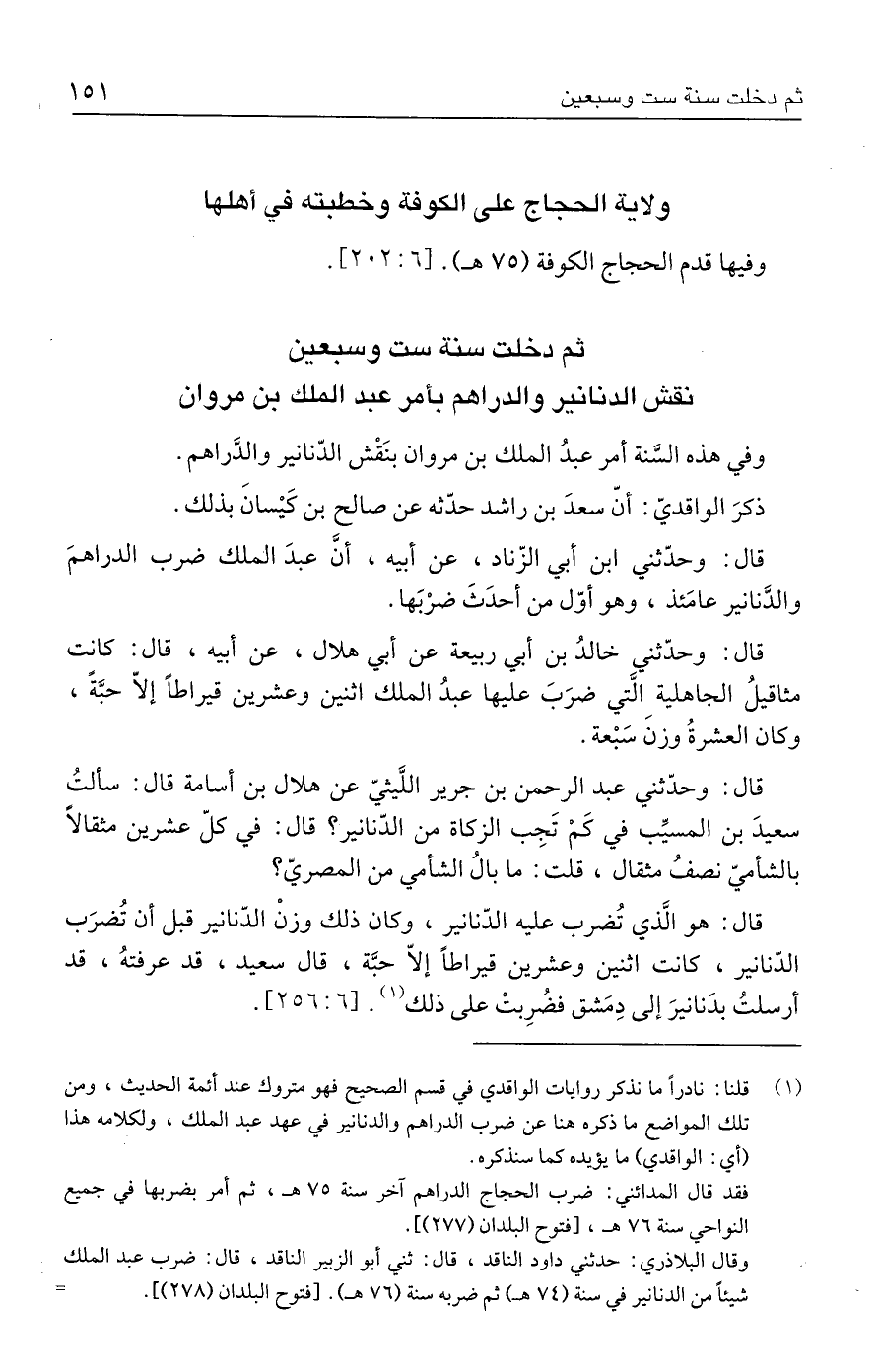 (١) قلنا: نادرًا ما نذكر روايات الواقدي في قسم الصحيح فهو متروك عند أئمة الحديث، ومن تلك المواضع ما ذكره هنا عن ضرب الدراهم والدنانير في عهد عبد الملك، ولكلامه هذا (أي: الواقدي) ما يؤيده كما سنذكره.