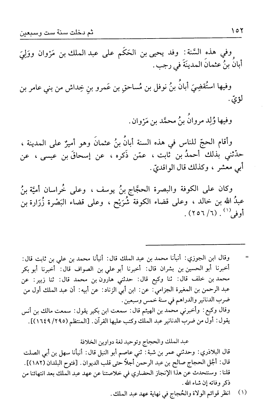 = وقال ابن الجوزي: أنبأنا محمد بن عبد الملك قال: أنبأنا محمد بن علي بن ثابت قال: أخبرنا أبو الحسين بن بشران قال: أخبرنا أبو علي بن الصواف قال: أخبرنا أبو بكر محمد بن خلف قال: ثنا وكيع قال: حدثني هارون بن محمد قال: ثنا زبير: عن عبد الرحمن بن المغيرة الجزامي: عن: ابن أبي الزناد: عن أبيه: أن عبد الملك أول من ضرب الدنانير والدراهم في سنة خمس وسبعين.