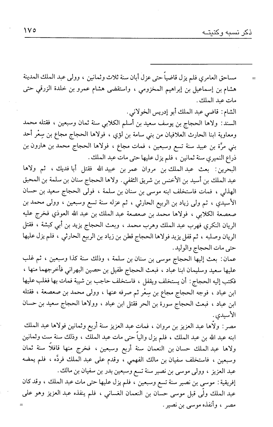 مصر: ولّاها عبد العزيز بن صروان، فمات عبد العزيز سنة أربع وثمانين فولاها عبد الملك ابنه عبد الله بن عبد الملك، فلم يزل واليًا حتى مات عبد الملك، وذلك سنة ست وثمانين ولاها عبد الملك حسان بن النعمان سنة أربع وسبعين، فخرج منها قافلًا سنة ثمان وسبعين، فاستخلف سفيان بن مالك الفهمي، وقدم على عبد الملك فردَّه، فلم يمضه عبد العزيز، وولى موسى بن نصير سنة تسع وسبعين بدر بن سفيان بن مالك.