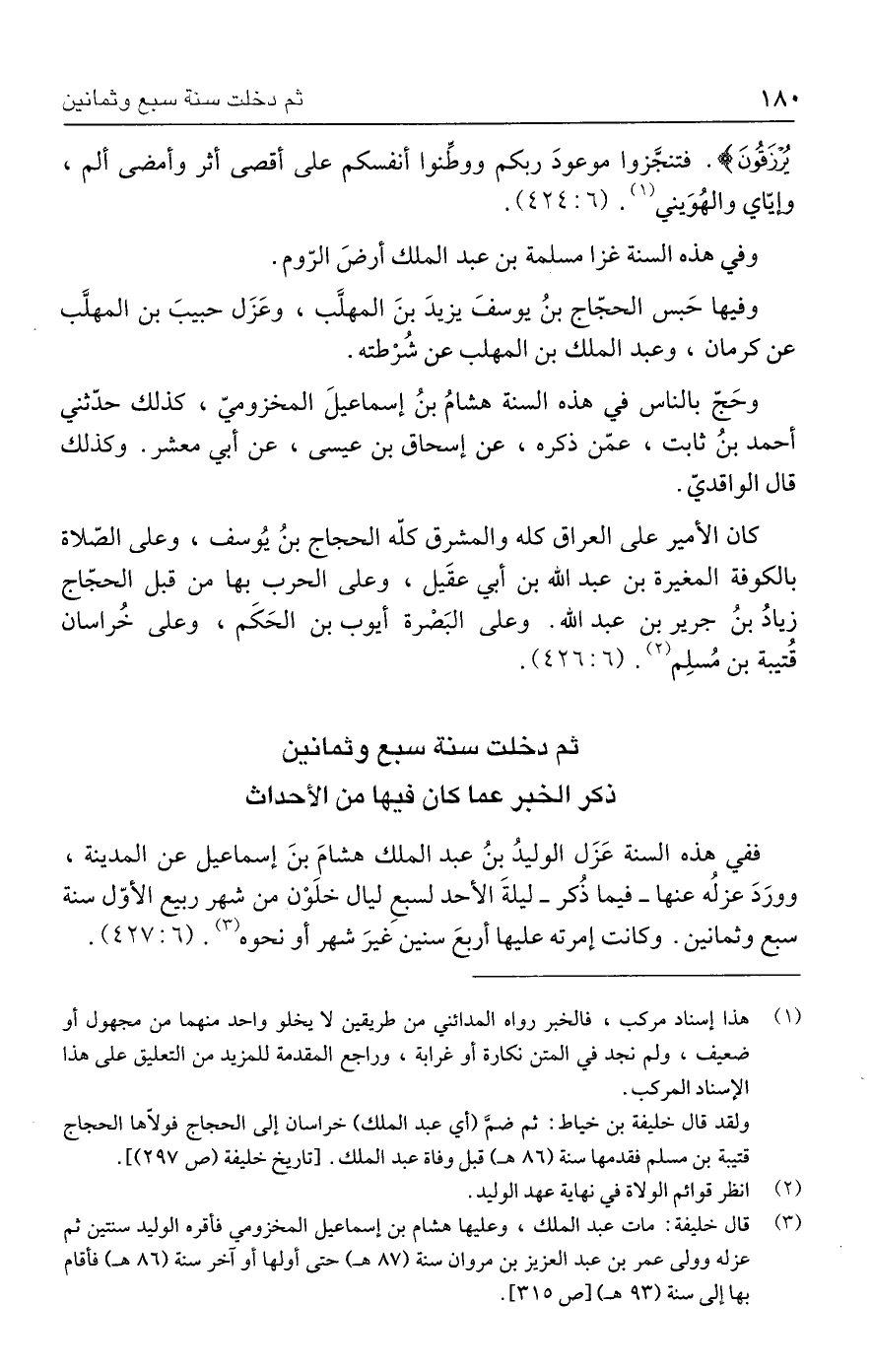 ففي هذه السنة عَزَل الوليدُ بن عبد الملك هشامَ بنَ إسماعيل عن المدينة، وورَدَ عزلُه عنها - فيما ذُكر - ليلةَ الأحد لسبعِ ليال خلَوْن من شهر ربيع الأوّل سنة سبع وثمانين. وكانت إمرته عليها أربعَ سنين غيرَ شهر أو نحوه (٣). (٦: ٤٢٧).