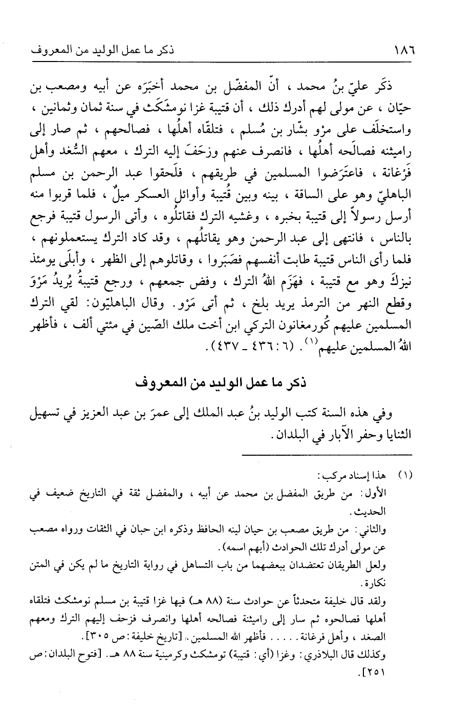 ولقد قال خليفة متحدثًا عن حوادث سنة (٨٨ هـ) فيها غزا قتيبة بن مسلم نومشكث فتلقاه أهلها فصالحوه ثم سار إلى راميثنة فصالحه أهلها وانصرف فزحف إليهم الترك ومعهم الصغد، وأهل فرغانة .... فأظهر الله المسلمين. [تاريخ خليفة: ص ٣٠٥].