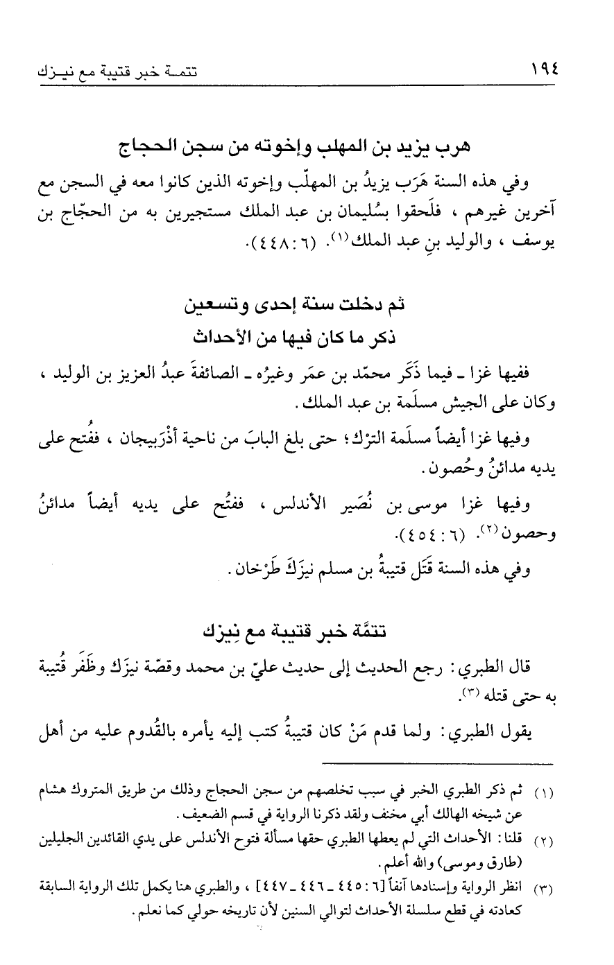 (٢) قلنا: الأحداث التي لم يعطها الطبري حقها مسألة فتوح الأندلس على يدي القائدين الجليلين (طارق وموسى) والله أعلم.