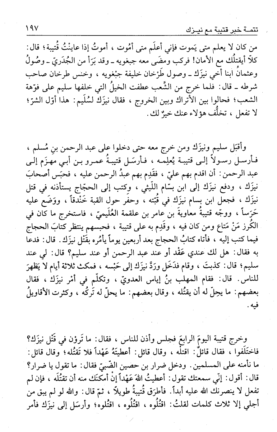 وأقبَل سليم ونيزَك ومن خرج معه حتى دخلوا على عبد الرحمن بن مُسلم، فأرسل رسولًا إلى قتيبة يُعلِمه، فأرسَل قتيبةُ عمرو بن أبي مهزَم إلى عبد الرحمن؛ أن اقدم بهم عليّ، فقَدِم بهم عبدُ الرحمن عليه، فحبَس أصحابَ نيزَك، ودفع نيزَك إلى ابن بسّام اللّيثي، وكتب إلى الحجّاج يستأذنه في قتل نيزَك، فجعل ابن بسام نيزَك في قُبّته، وحفر حول القبة خَنْدقًا، ووَضَع عليه حَرَسًا، ووجّه قتيبةُ معاويةَ بن عامر بن علقمة العُلَيميّ، فاستخرج ما كان في الكُرز مَنْ مَتاع ومن كان فيه، وقَدِم به على قتيبة، فحبسهم ينتظر كتابَ الحجاج فيما كتب إليه، فأتاه كتابُ الحجاج بعد أربعين يومًا يأمُره بقَتْل نيزَك. قال: فدعا به فقال: هل لك عندي عَقْد أو عند عبد الرحمن أو عند سليم؟ قال: لي عند سليم؛ قال: كذبتَ، وقام فدَخَل ورَدَّ نيزَك إلى حَبْسه، فمكث ثلاثة أيام لا يَظهرَ للناس. قال: فقام المهلب بن إياس العدويّ، وتكلّمِ في أمْر نيزَك، فقال بعضهم: ما يحِلّ له أن يقتله، وقال بعضهم: ما يحلّ له تركُه، وكثرت الأقاويلُ فيه.