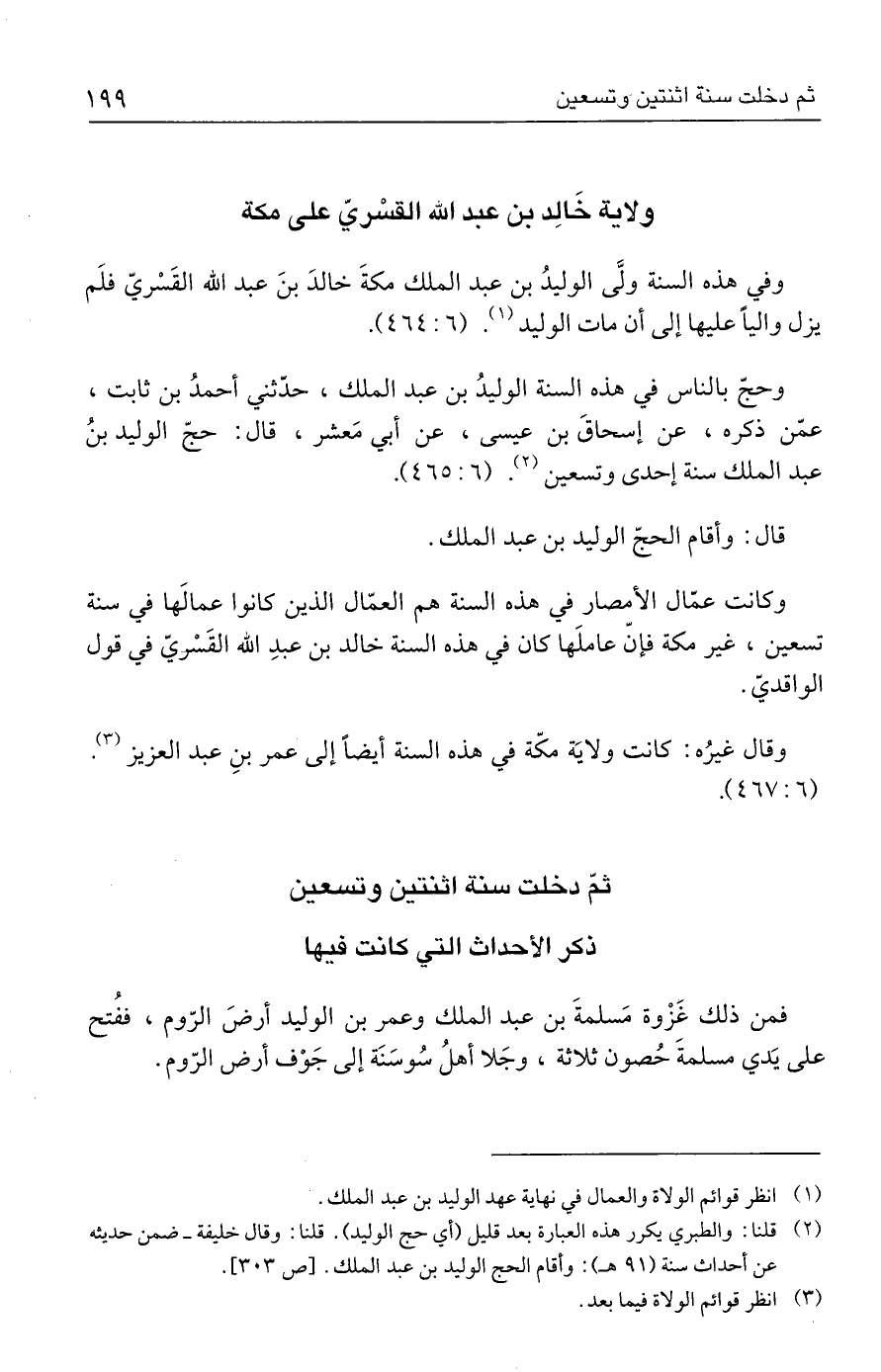 (٢) قلنا: والطبري يكرر هذه العبارة بعد قليل (أي حج الوليد). قلنا: وقال خليفة - ضمن حديثه عن أحداث سنة (٩١ هـ): وأقام الحج الوليد بن عبد الملك. [ص ٣٠٣].
