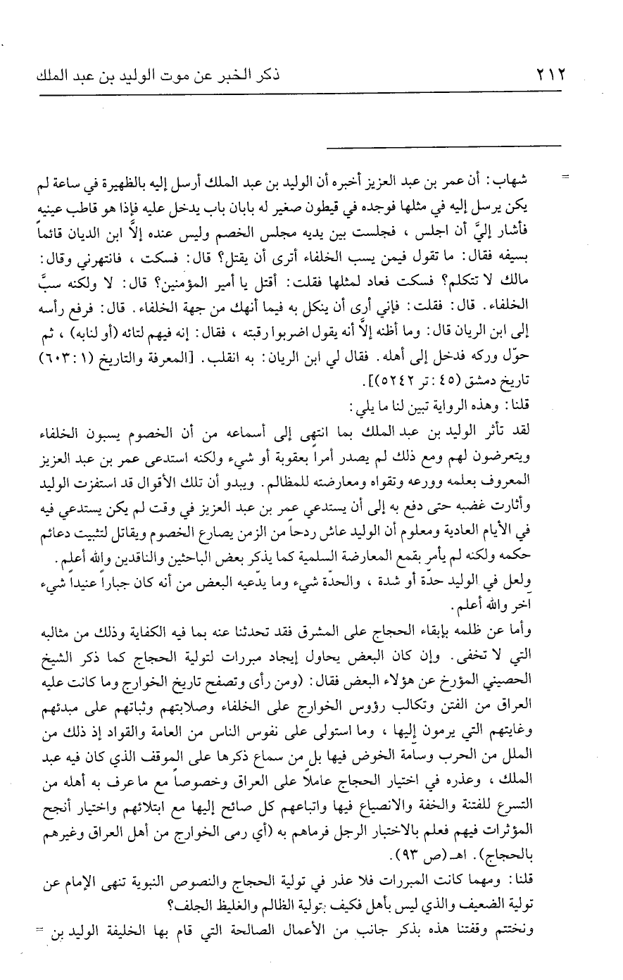 = شهاب: أن عمر بن عبد العزيز أخبره أن الوليد بن عبد الملك أرسل إليه بالظهيرة في ساعة لم يكن يرسل إليه في مثلها فوجده في قيطون صغير له بابان باب يدخل عليه فإذا هو قاطب عينيه فأشار إليَّ أن اجلس، فجلست بين يديه مجلس الخصم وليس عنده إلَّا ابن الديان قائمًا بسيفه فقال: ما تقول فيمن يسب الخلفاء أترى أن يقتل؟ قال: فسكت، فانتهرني وقال: ما لك لا تتكلم؟ فسكت فعاد لمثلها فقلت: أقتل يا أمير المؤمنين؟ قال: لا ولكنه سبَّ الخلفاء. قال: فقلت: فإني أرى أن ينكل به فيما أنهك من جهة الخلفاء. قال: فرفع رأسه إلى ابن الريان قال: وما أظنه إلَّا أنه يقول اضربوا رقبته، فقال: إنه فيهم لتائه (أو لنابه)، ثم حوّل وركه فدخل إلى أهله. فقال لي ابن الريان: به انقلب. [المعرفة والتاريخ (١: ٦٠٣) تاريخ دمشق (٤٥: تر ٥٢٤٢)].