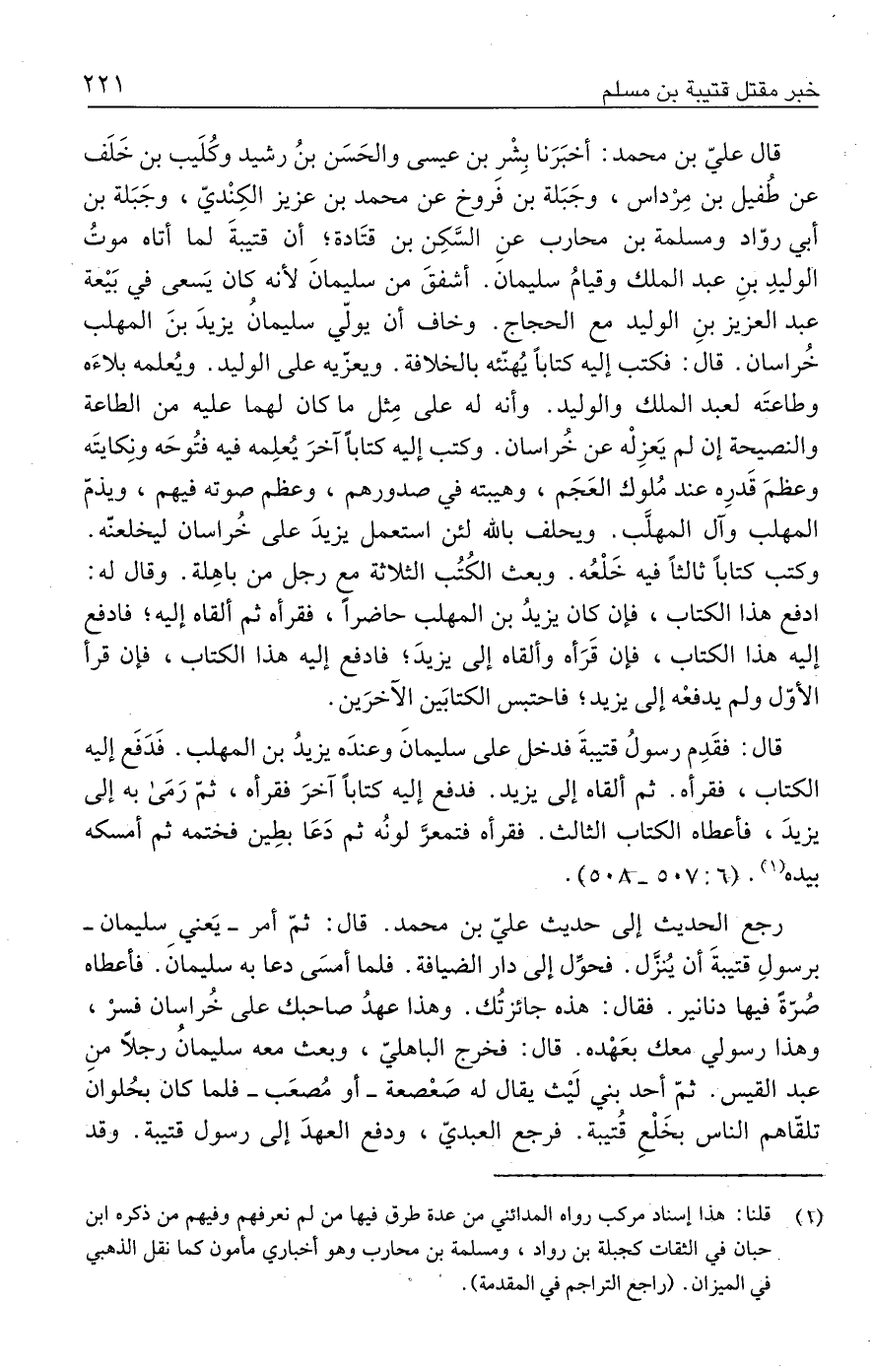 قال عليّ بن محمد: أخبَرَنا بِشْرِ بن عيسى والحَسَن بن رشيد وكُلَيب بن خَلَف عن طُفيل بن مِرْداس، وجَبَلة بن فروخ عن محمد بن عزيز الكِنْديّ، وجَبَلة بن أبي روّاد ومسلمة بن محارب عنِ السَّكِن بن قتَادة؛ أن قتيبةَ لما أتاه موتُ الوليدِ بن عبد الملك وقيامُ سليمان. أشفقَ من سليمانَ لأنه كان يَسعى في بَيعة عبد العزيز بن الوليد مع الحجاج. وخاف أن يولّي سليمانُ يزيدَ بنَ المهلب خُراسان. قال: فكتب إليه كتابًا يُهنّئه بالخلافة. ويعزّيه على الوليد. ويُعلمه بلاءَه وطاعتَه لعبد الملك والوليد. وأنه له على مِثل ماكان لهما عليه من الطاعة والنصيحة إن لم يَعزِلْه عن خُراسان. وكتب إليه كتابًا آخرَ يُعلِمه فيه فتُوحَه ونِكايتَه وعظمَ قَدرِه عند مُلوك العَجَم، وهيبته في صدورهم، وعظم صوته فيهم، ويذمّ المهلب وآل المهلَّب. ويحلف بالله لئن استعمل يزيدَ على خُراسان ليخلعنّه. وكتب كتابًا ثالثانيه خَلْعُه. وبعث الكُتُب الثلاثة مع رجل من باهِلة. وقال له: ادفع هذا الكتاب، فإن كان يزيدُ بن المهلب حاضرًا، فقرأه ثم ألقاه إليه؛ فادفع إليه هذا الكتاب، فإن قَرَأه وألقاه إلى يزيدَ؛ فادفع إليه هذا الكتاب، فإن قرأ الأوّل ولم يدفعْه إلى يزيد؛ فاحتبس الكتابَين الآخرَين.