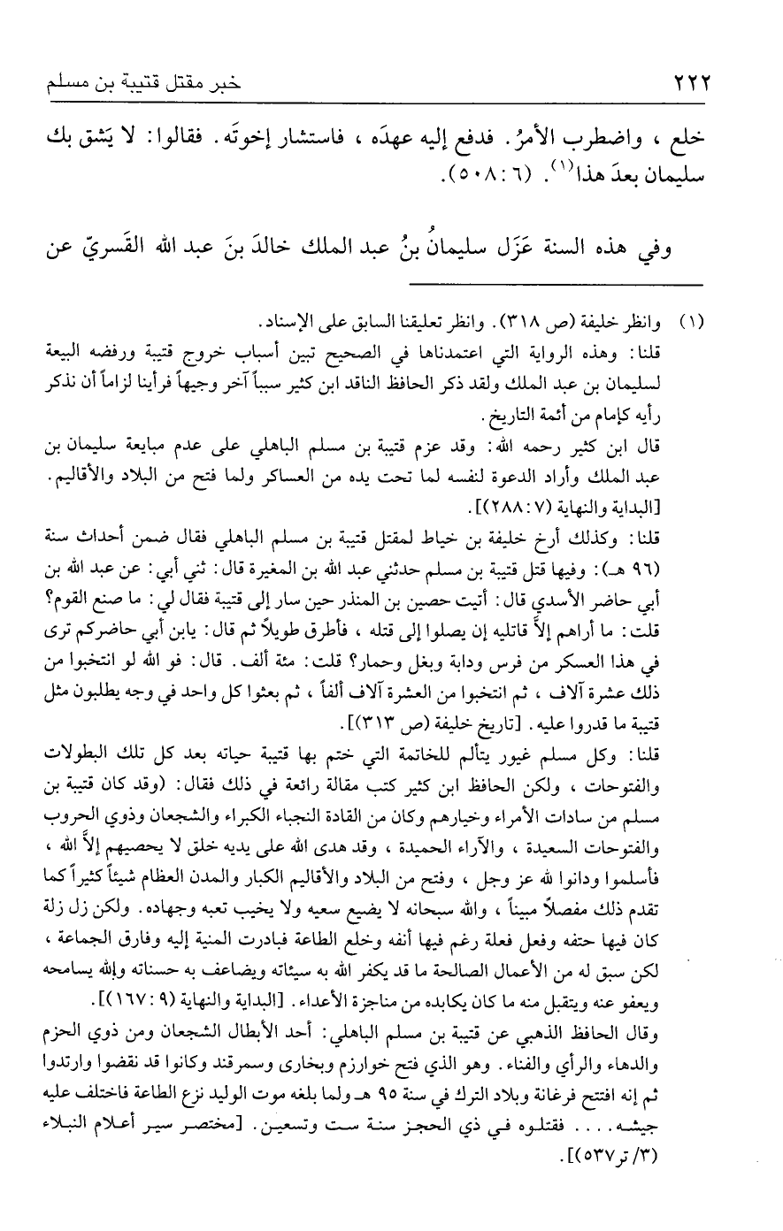 قلنا: وكذلك أرخ خليفة بن خياط لمقتل قتيبة بن مسلم الباهلي فقال ضمن أحداث سنة (٩٦ هـ): وفيها قتل قتيبة بن مسلم حدثني عبد الله بن المغيرة قال: ثني أبي: عن عبد الله بن أبي حاضر الأسدي قال: أتيت حصين بن المنذر حين سار إلى قتيبة فقال لي: ما صنع القوم؟ قلت: ما أراهم إلَّا قاتليه إن يصلوا إلى قتله، فأطرق طويلًا ثم قال: يابن أبي حاضركم ترى في هذا العسكر من فرس ودابة وبغل وحمار؟ قلت: مئة ألف. قال: فوالله لو انتخبوا من ذلك عشرة آلاف، ثم انتخبوا من العشرة آلاف ألفًا، ثم بعثوا كل واحد في وجه يطلبون مثل قتيبة ما قدروا عليه. [تاريخ خليفة (ص ٣١٣)].