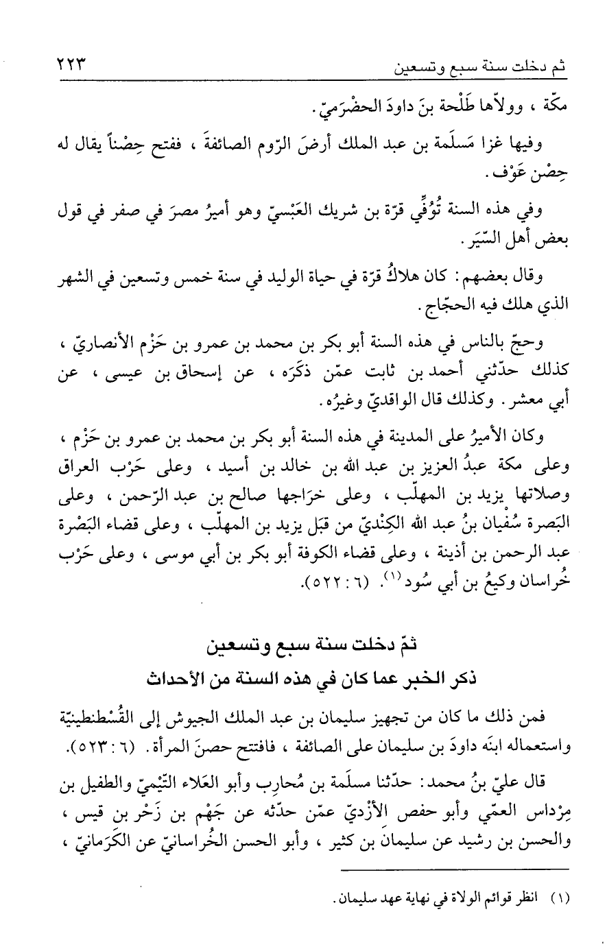 وكان الأميرُ على المدينة في هذه السنة أبو بكر بن محمد بن عمرو بن حَزْم، وعلى مكة عبدُ العزيز بن عبد الله بن خالد بن أسيد، وعلى حَرْب العراق وصلاتها يزيد بن المهلّب، وعلى خرَاجها صالح بن عبد الرّحمن، وعلى البَصرة سُفْيان بن عبد الله الكِنْديّ من قبَل يزيد بن المهلّب، وعلى قضاء البَصْرة عبد الرحمن بن أذينة، وعلى قضاء الكوفة أبو بكر بن أبي موسى، وعلى حَرْب خُراسان وكيعُ بن أبي سُود (١). (٦: ٥٢٢).