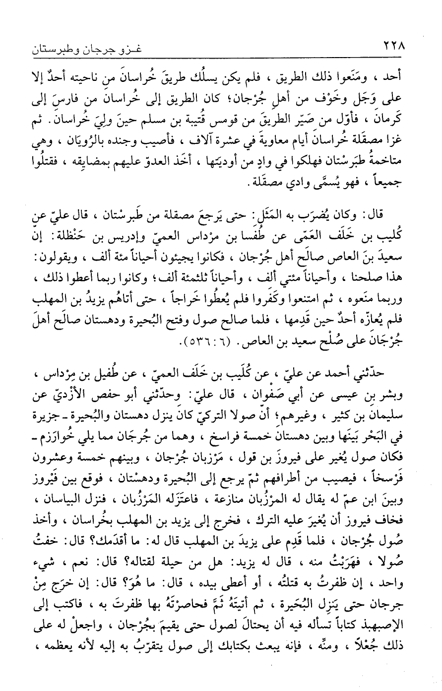 قال: وكان يُضرَب به المَثَل: حتى يَرجعَ مصقلة من طَبرسْتان، قال عليّ عن كُليب بن خَلَف العَمّى عن طُفَسا بن مرْداس العميّ وإدريس بن حَنْظلة: إنّ سعيدَ بنَ العاص صالح أهل جُرْجان، فكانوا يجيئون أحيانًا مئة ألف، ويقولون: هذا صلحنا، وأحيانًا مئتي ألف، وأحيانًا ثلثمئة ألف؛ وكانوا ربما أعطوا ذلك، وربما منَعوه، ثم امتنعوا وكَفَروا فلم يُعطُوا خَراجًا، حتى أتاهُم يزيدُ بن المهلب فلم يُعازّه أحدٌ حين قَدِمها، فلما صالح صول وفتح البُحيرة ودهستان صالح أهلَ جُرْجَانَ على صُلْح سعيد بن العاص. (٦: ٥٣٦).