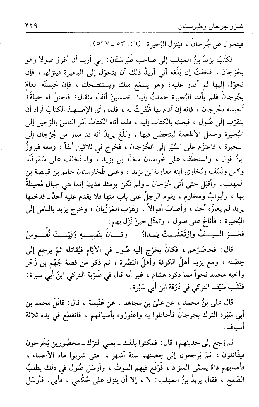 قال: فحاصَرَهم، فكانَ يخرُج إليه صُول في الأيَّام فيُقاتله ثمّ يرجع إلى حِصْنه، ومع يزيد أهلُ الكوفة وأهلُ البَصْرة، ثم ذكر من قصة جَهْم بن زَحْر وأخيه محمد نحوًا مما ذكره هشام، غير أنه قال في ضَرْبة التركى ابنَ أبي سبرة: فنَشَب سَيف التركي في دَرَقة ابن أبي سَبْرة.